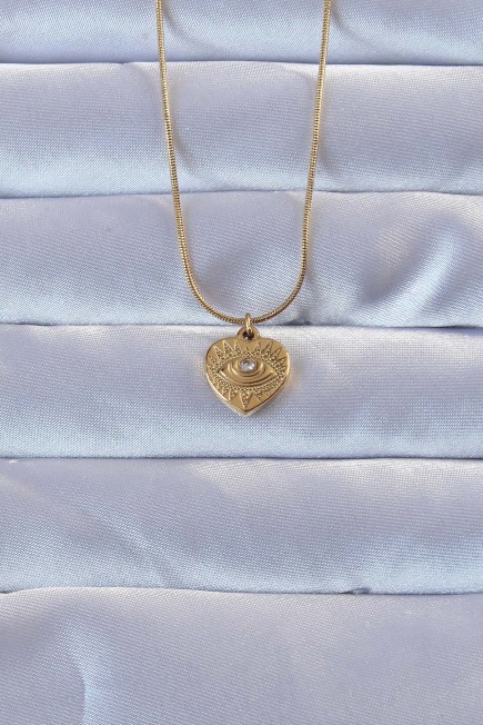 316L Altın Renk Zirkon Taşlı İşlemeli Göz Detay Kalp Kolye - 257565