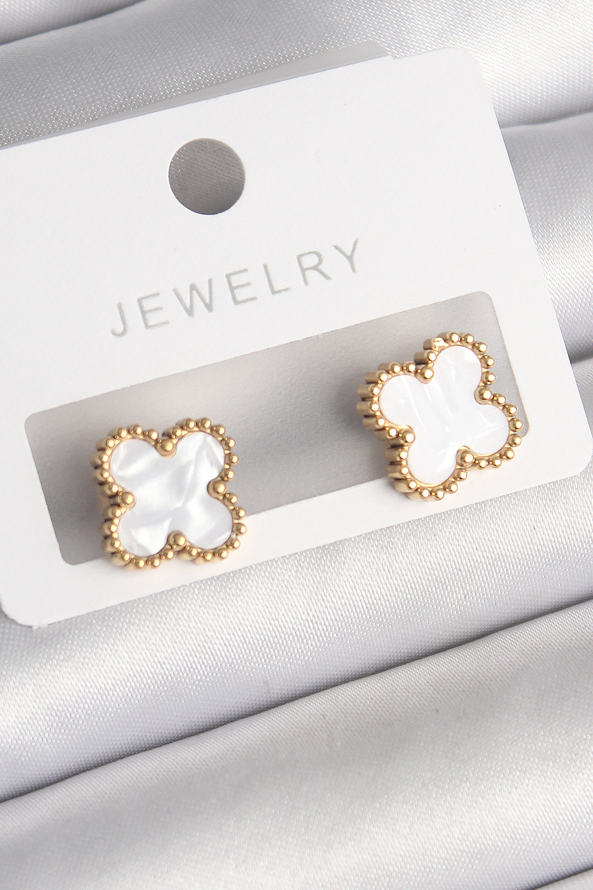 316L Çelik Gold Renk Beyaz Minelik Yonca Model Kadın Küpe - 260811