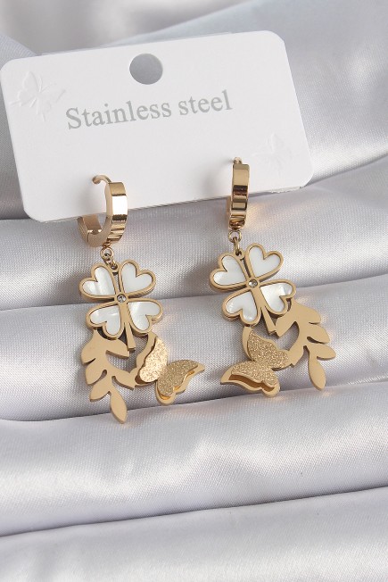 316L Çelik Gold Renk Beyaz Sedefli Yonca Simli Kelebek Figür Kadın Küpe - 258329