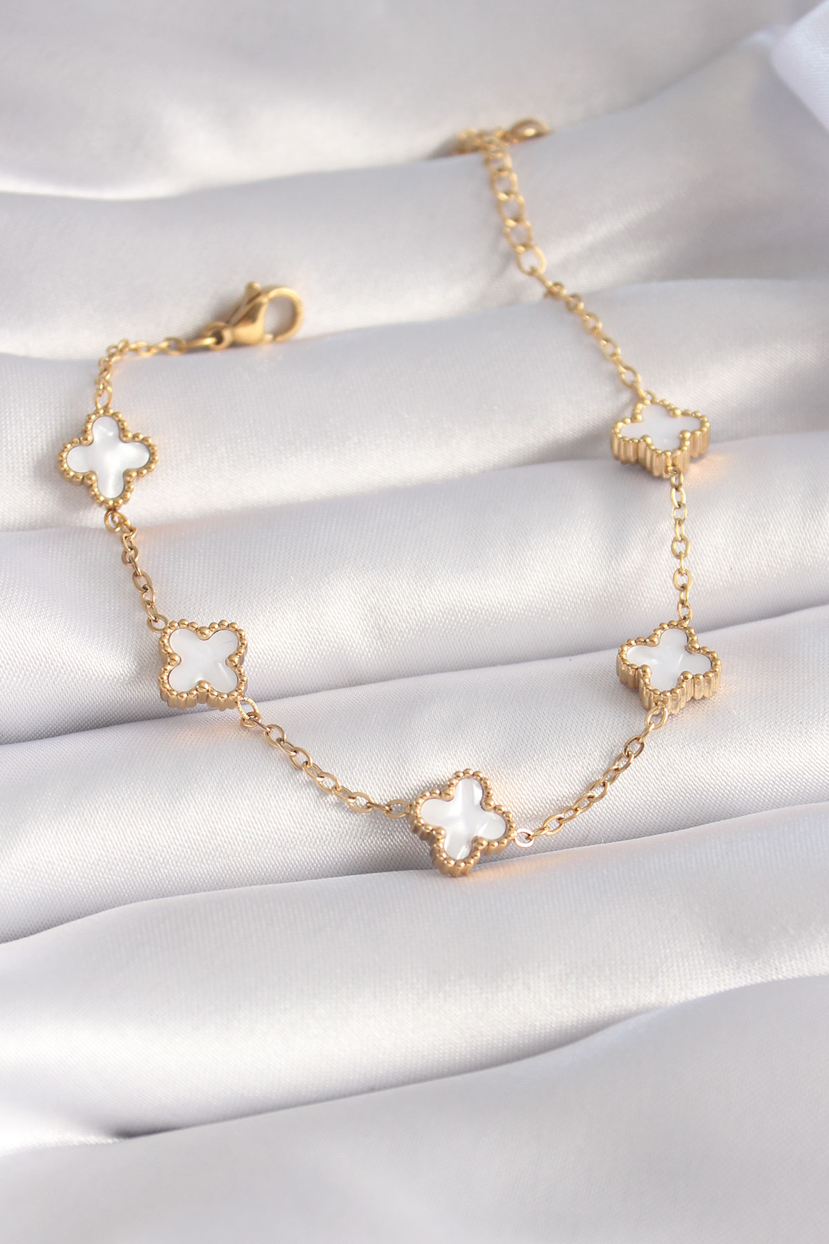 316L Çelik Gold Renk Beyaz Yonca Model Kadın Bileklik - 254058