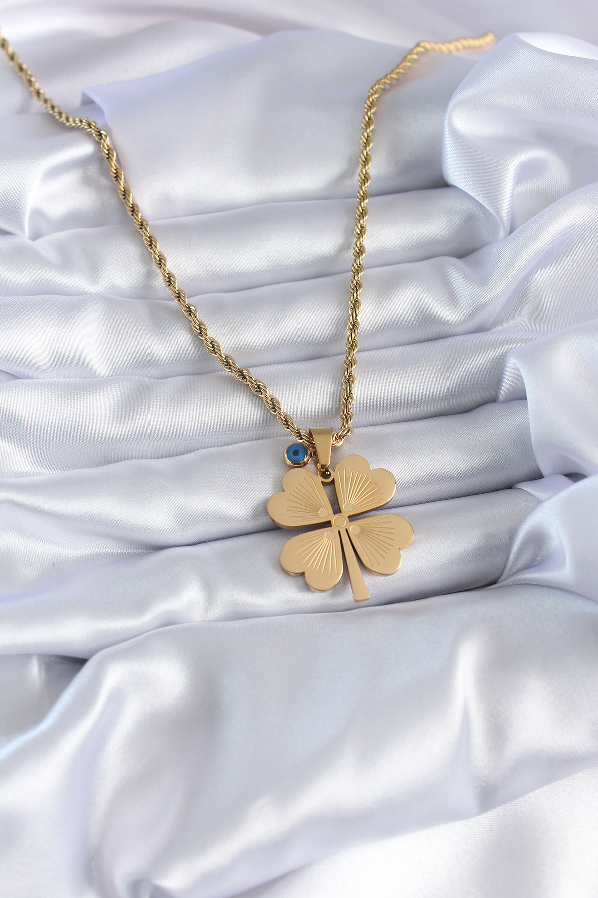 316L Çelik Gold Renk Burgu Model İşlemeli Yonca Figür Nazar Boncuk Detay Kadın Kolye - 251103