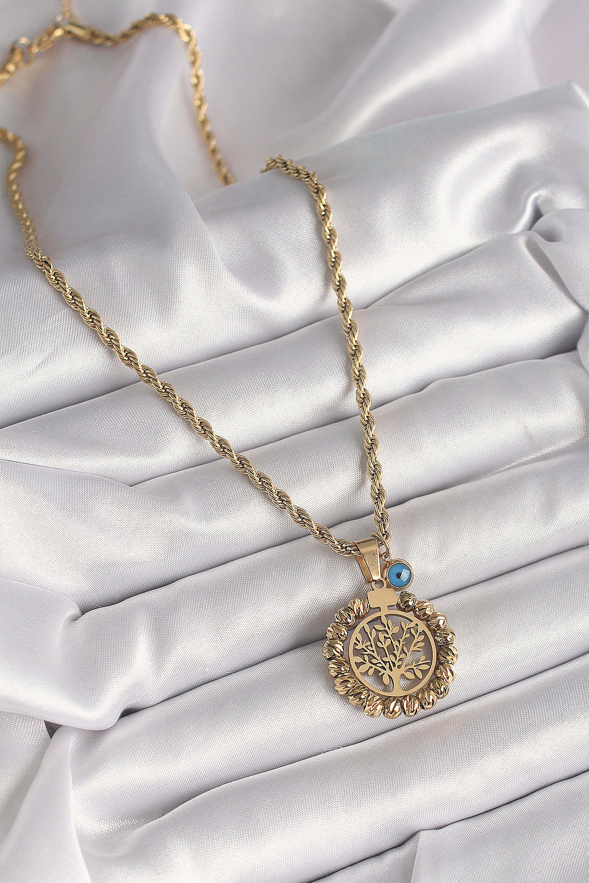 316L Çelik Gold Renk Burgu Zincir Dorika Yaşam Ağacı Figür Nazar Boncuk Detay Kadın Kolye - 260933