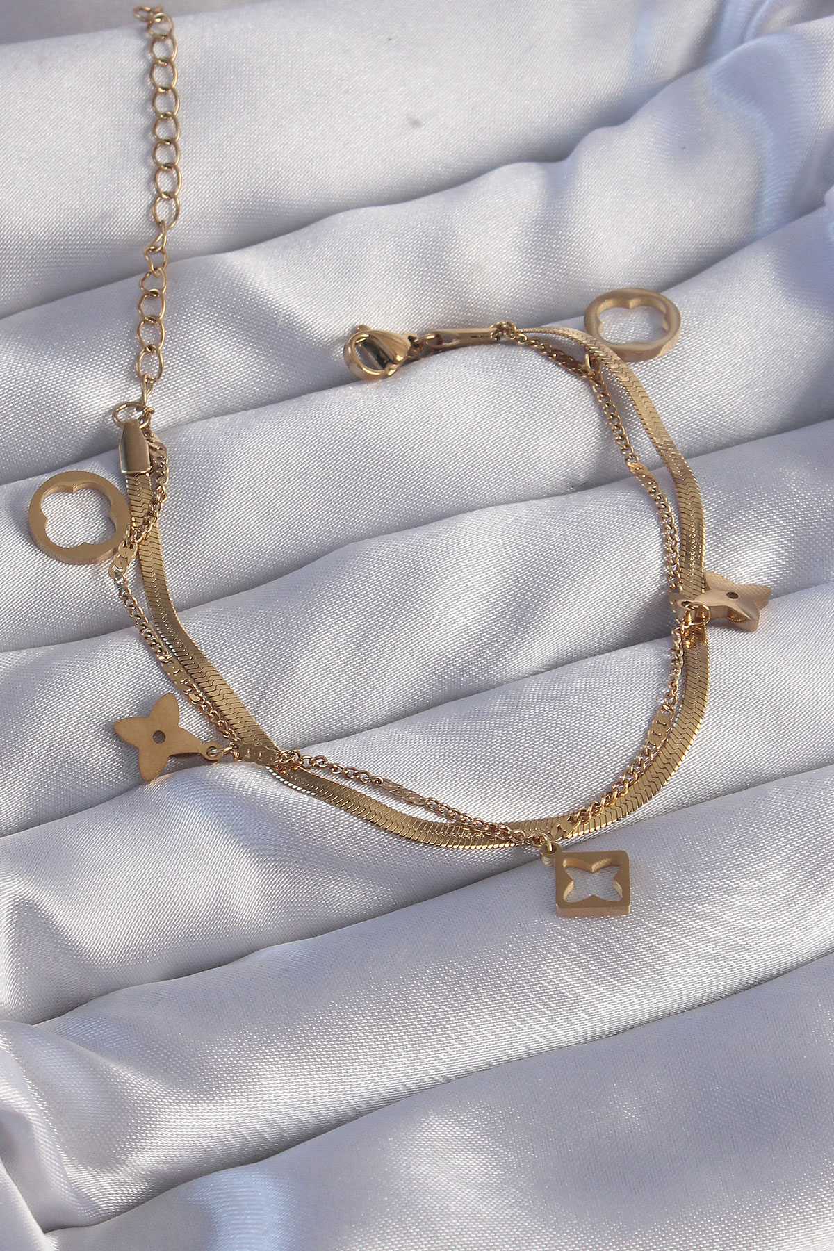 316L Çelik Gold Renk Çift Zincir Yonca Tasarım Bileklik - 256169