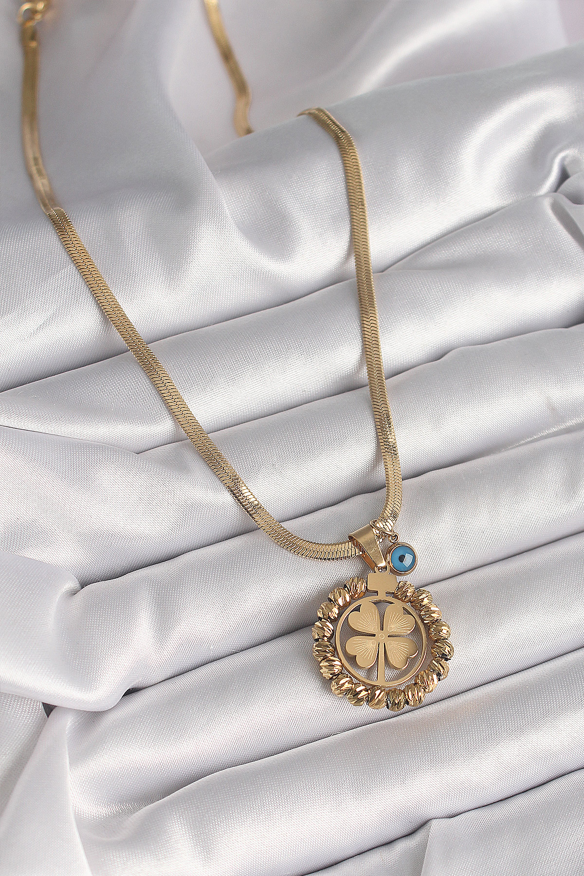 316L Çelik Gold Renk İtalyan Zincir Dorika Yonca Model Nazar Boncuk Detay Kadın Kolye - 260934