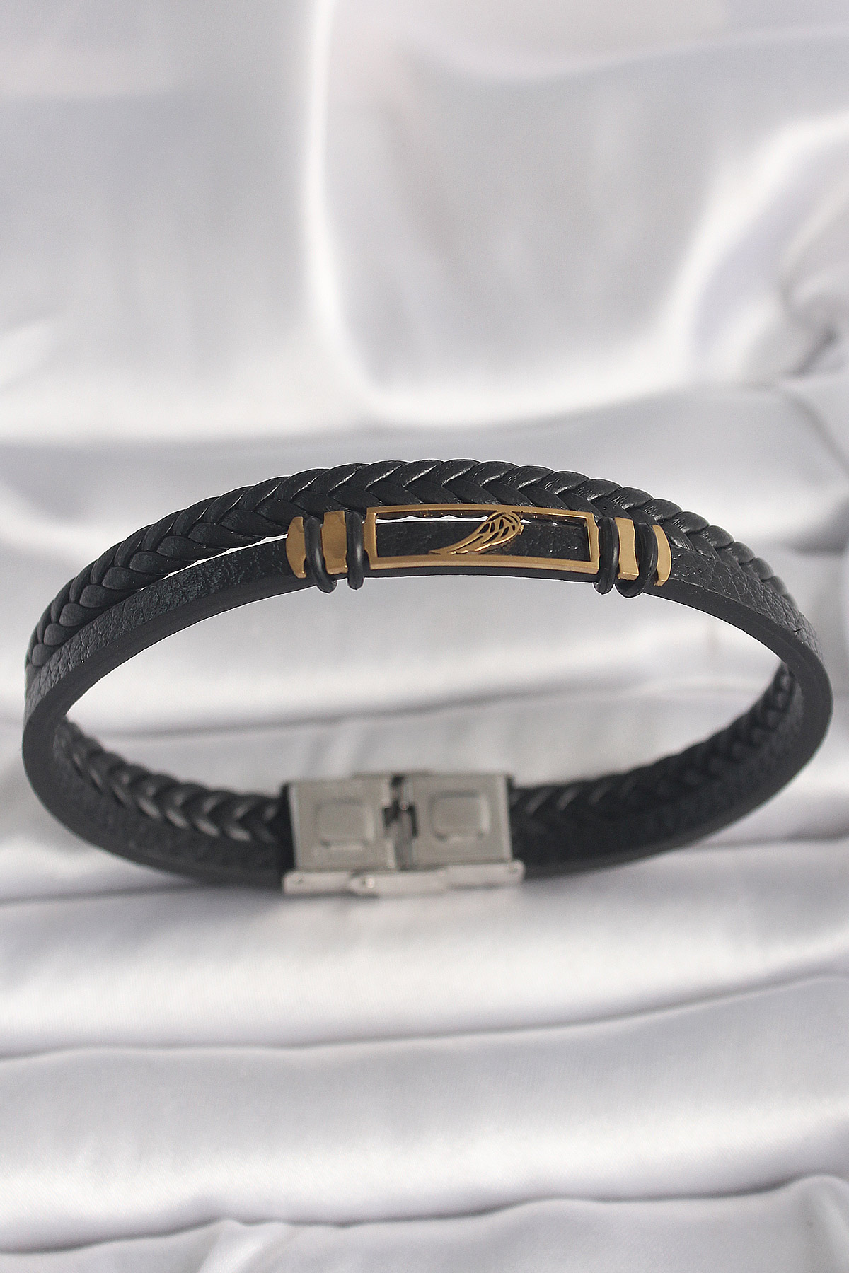 316L Çelik Gold Renk Kanat Aksesuarlı Siyah Burgu Model Deri Kordon Erkek Bileklik - 261419