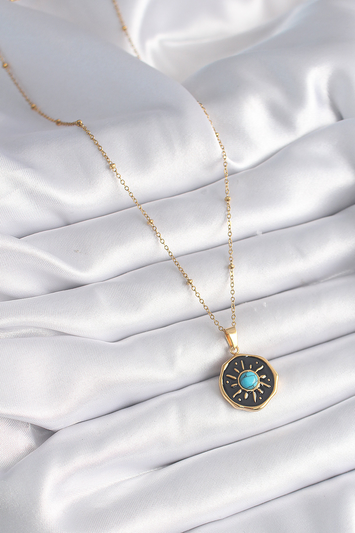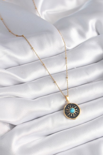 316L Çelik Gold Renk Mavi Boncuk Güneş İşleme Madalyon Model Kadın Kolye - 258989