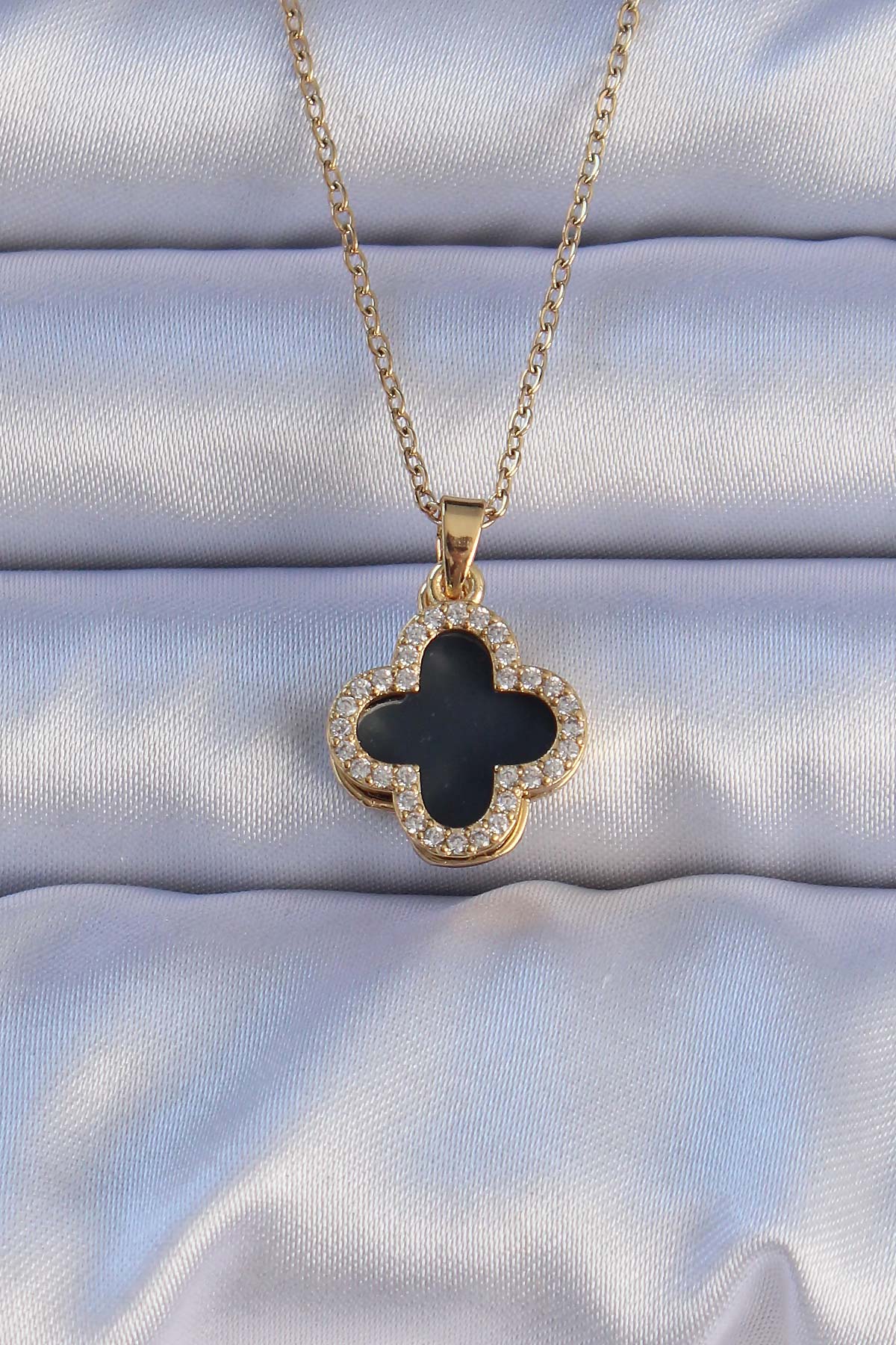 316L Çelik Gold Renk Siyah Mineli Zirkon Taşlı Yonca Figürlü Kolye - 257018