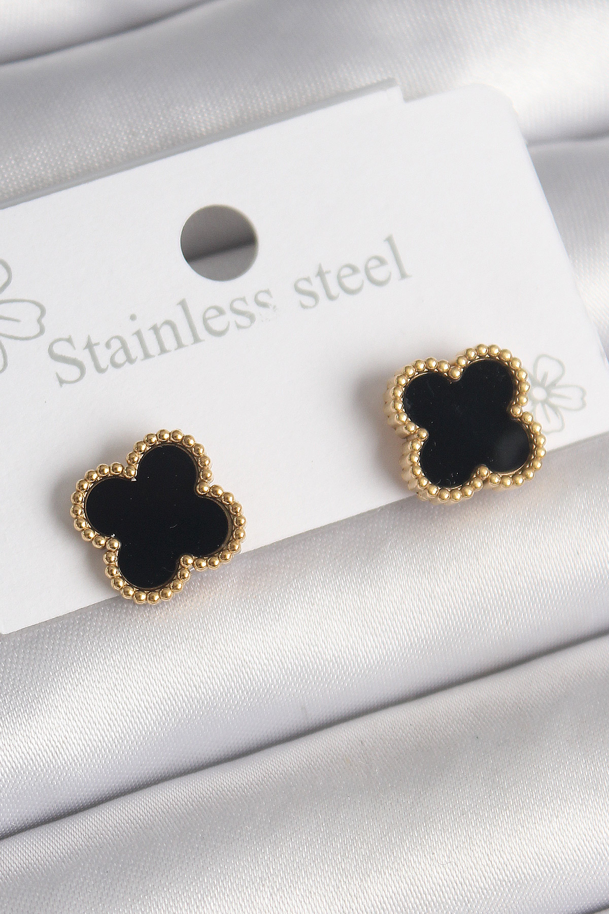 316L Çelik Gold Renk Siyah Yonca Model Kadın Küpe - 260813