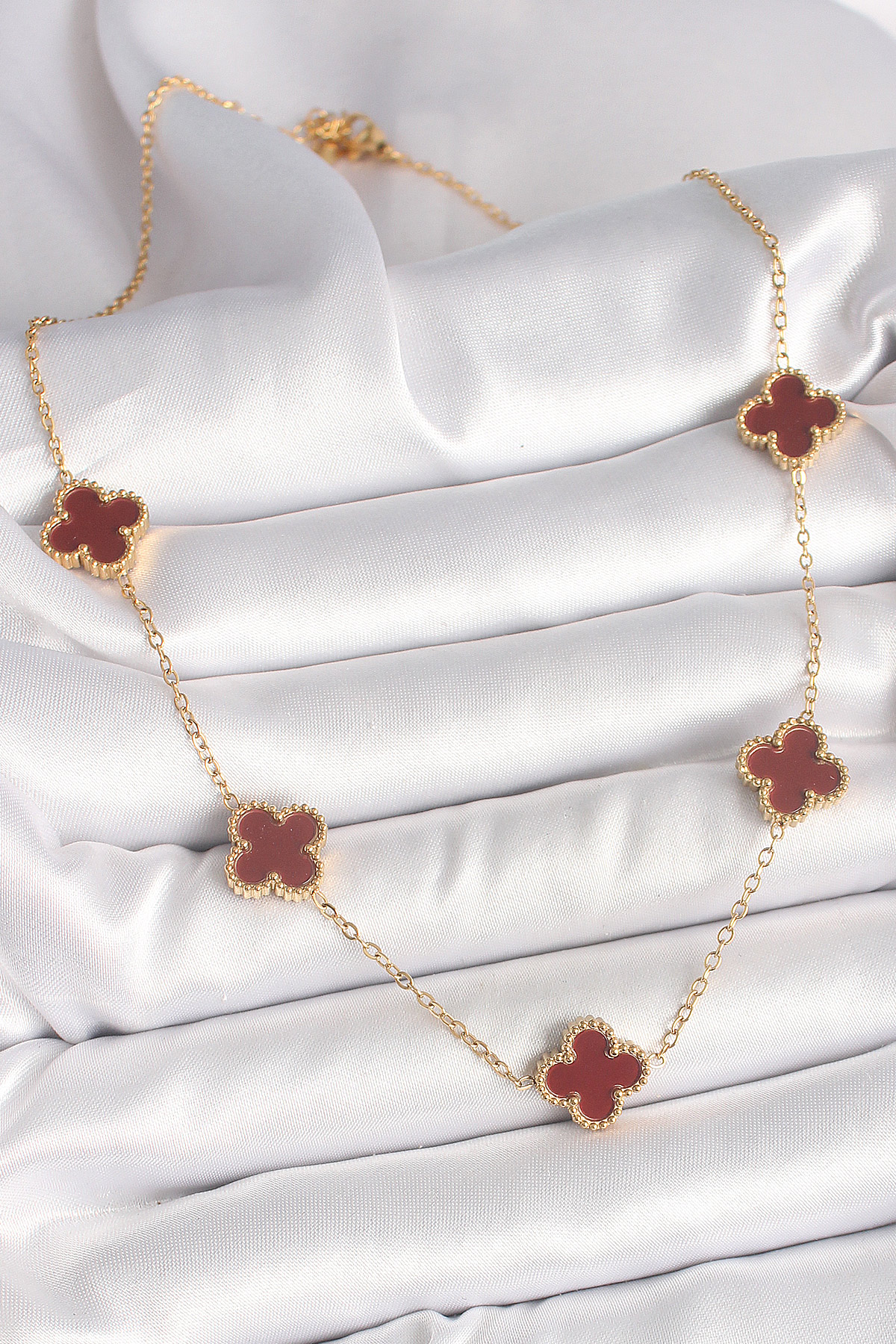 316L Çelik Gold Renk Zincir Bordo Yonca Model Kadın Kolye - 261373