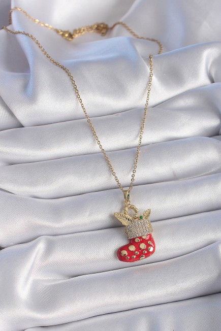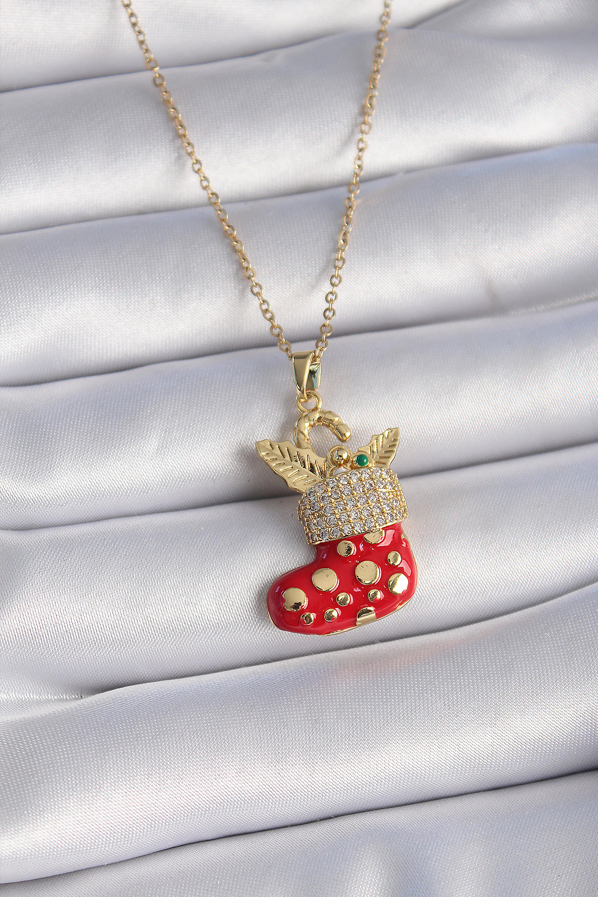 316L Çelik Gold Renk Zincir Zirkon Taşlı Yılbaşı Temalı Kırmızı Noel Çorabı Figür Kadın Kolye - 258603