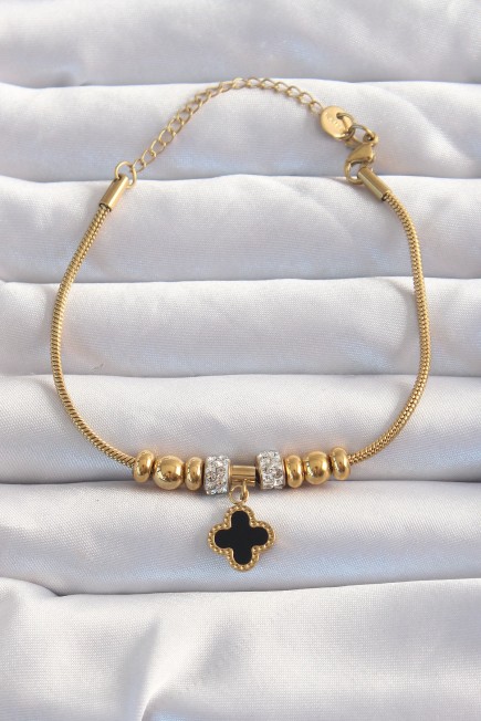 316L Çelik Gold Renk Zirkon Taş Aksesuarlı Siyah Mineli Yonca Bileklik - 256524