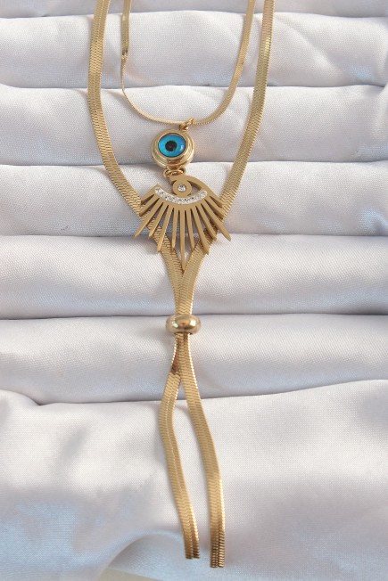 316L Çelik Gold Renk Zirkon Taşlı Göz Detay Nazarlı Uzun Asansör Model Kolye - 256540