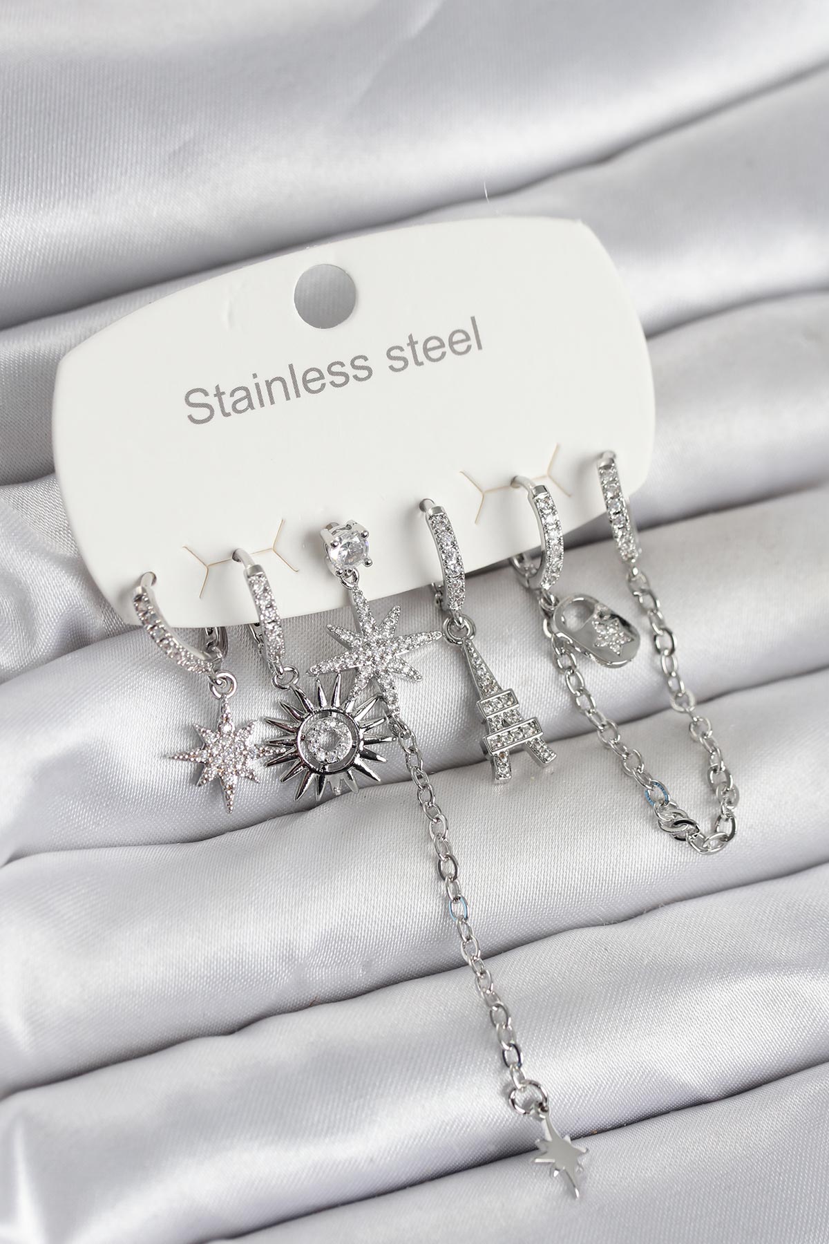316L Çelik Gümüş Renk 6'lı Set Charmlı Kadın Küpe - 268235