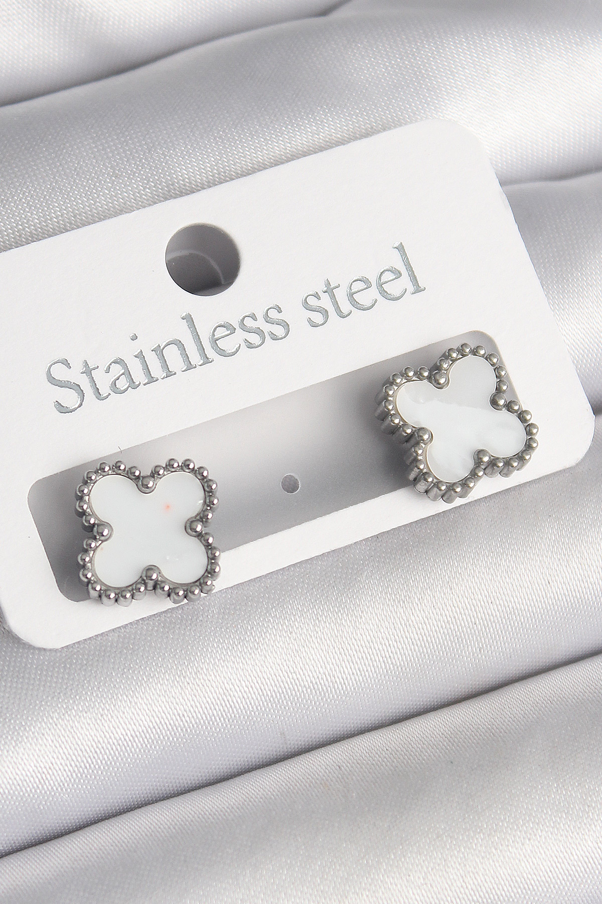 316L Çelik Gümüş Renk Beyaz Yonca Model Kadın Küpe - 260814