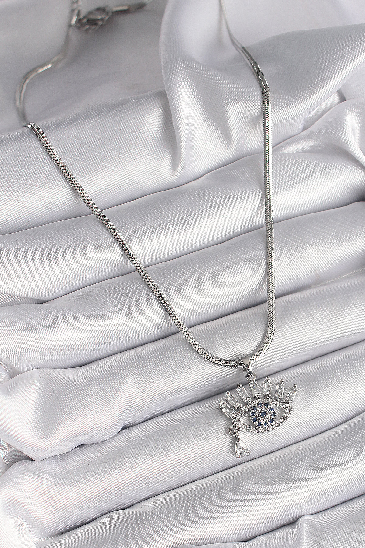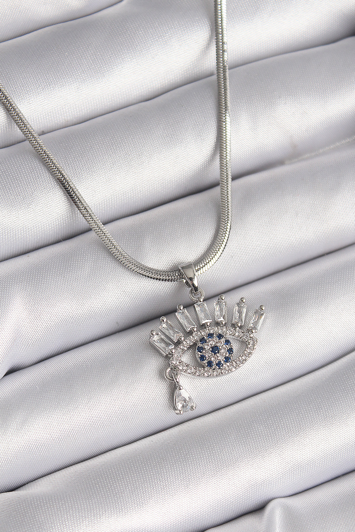 316L Çelik Gümüş Renk İtalyan Zincir Zirkon Taşlı Göz Model Kadın Kolye - 259370