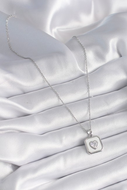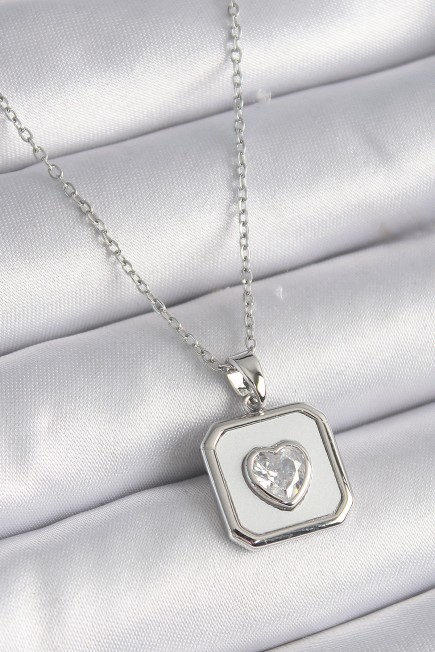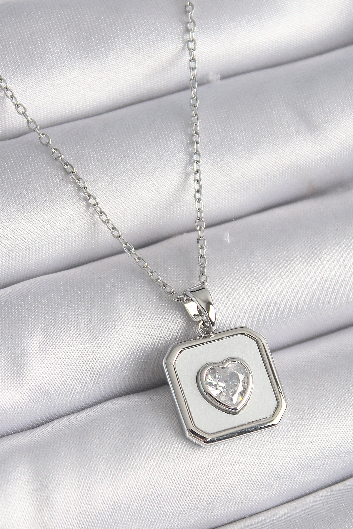 316L Çelik Gümüş Renk Kare Madalyon Kalp Zirkon Taş İşleme Kadın Kolye - 258990