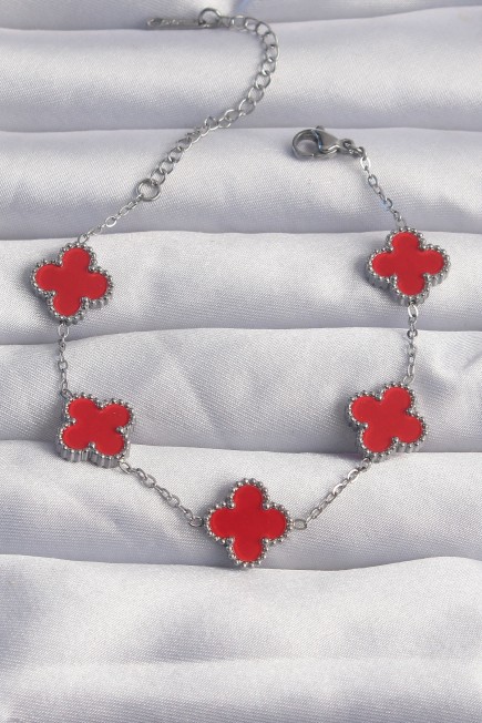316L Çelik Gümüş Renk Kırmızı Mineli Yonca Bileklik - 256679