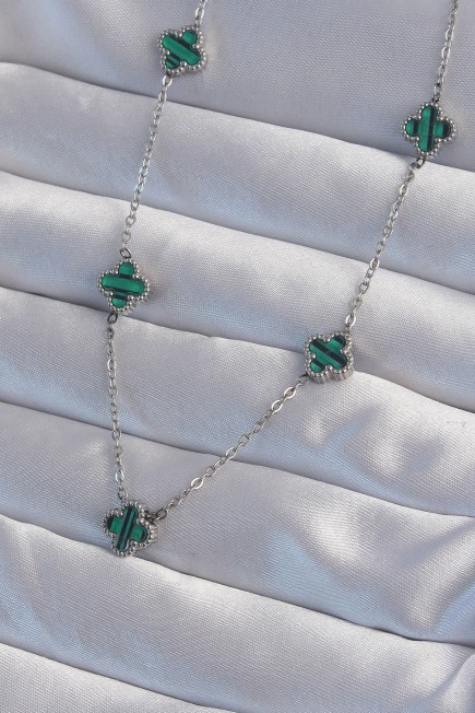 316L Çelik Gümüş Renk Minimal Yeşil Mineli Yonca Kolye - 256705