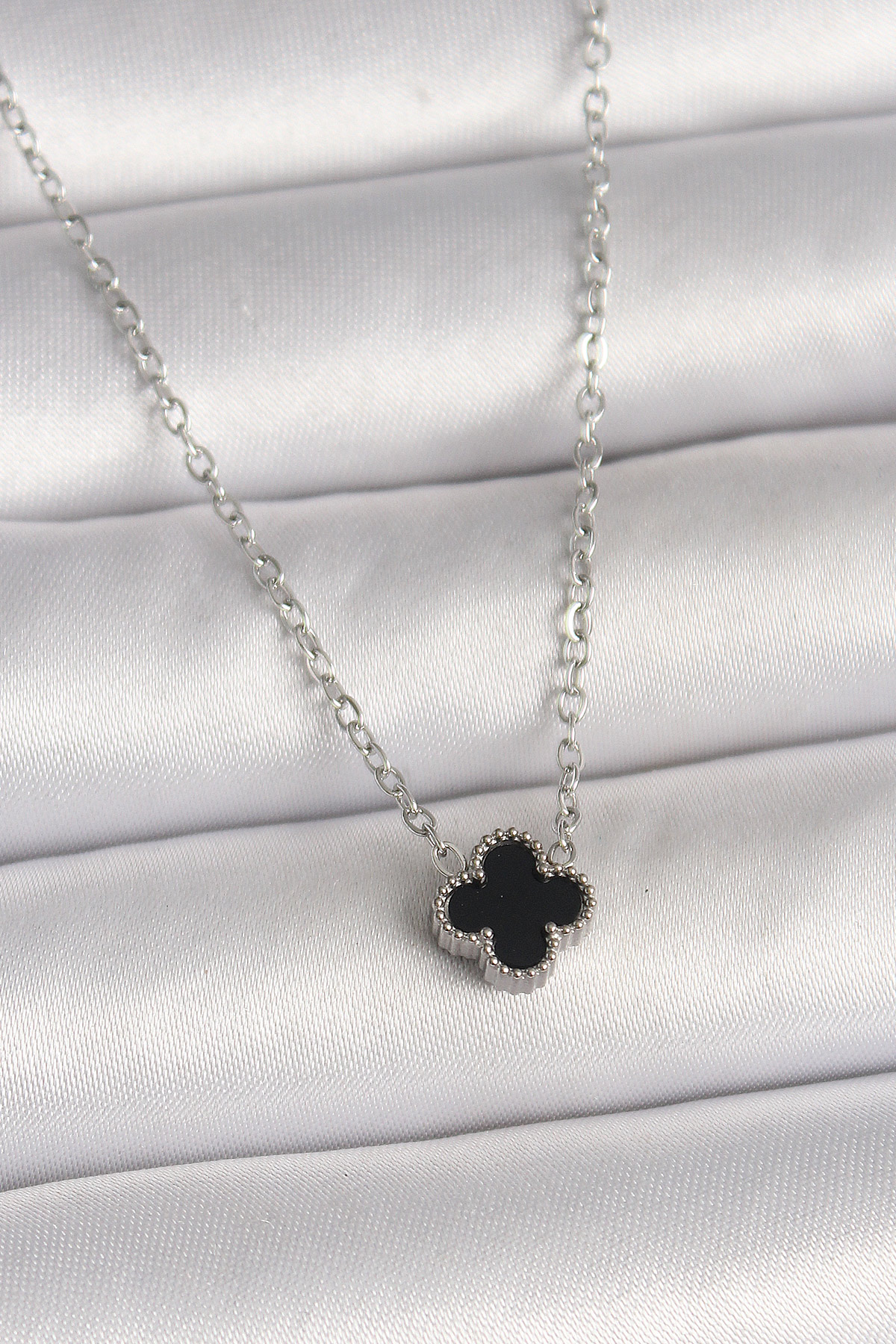 316L Çelik Gümüş Renk Siyah Yonca Model Kadın Kolye - 261997