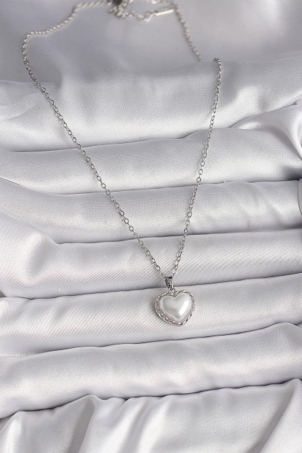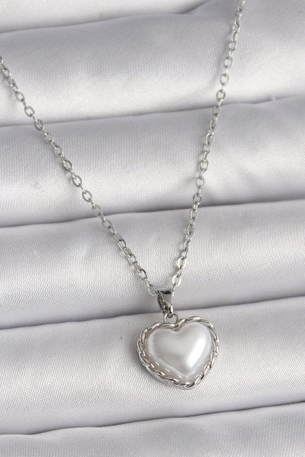 316L Çelik Gümüş Renk Zincir 3D İnci Kalp Model Kadın Kolye - 260219