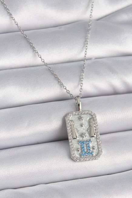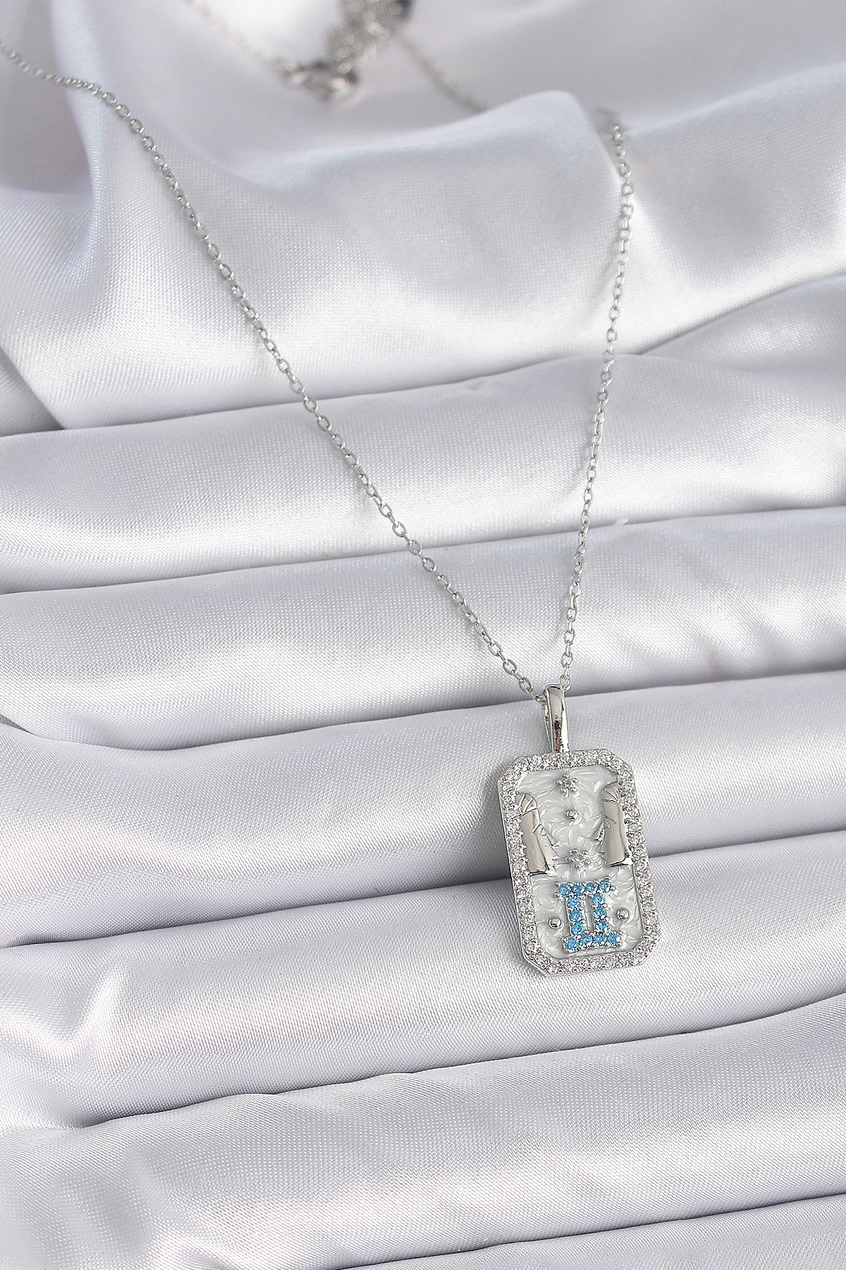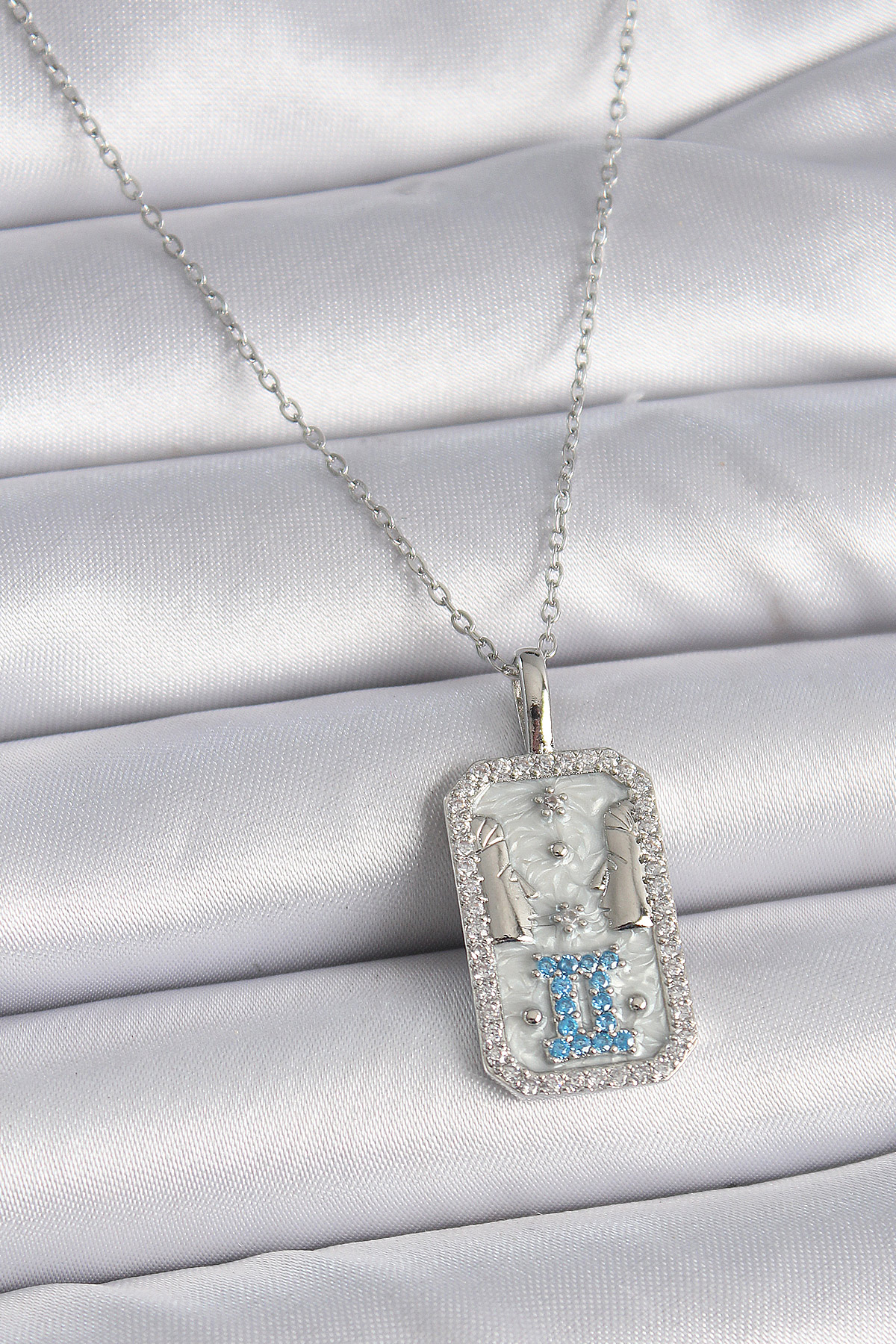 316L Çelik Gümüş Renk Zincir İkizler Burcu Zirkon Taşlı Kadın Kolye - 258629