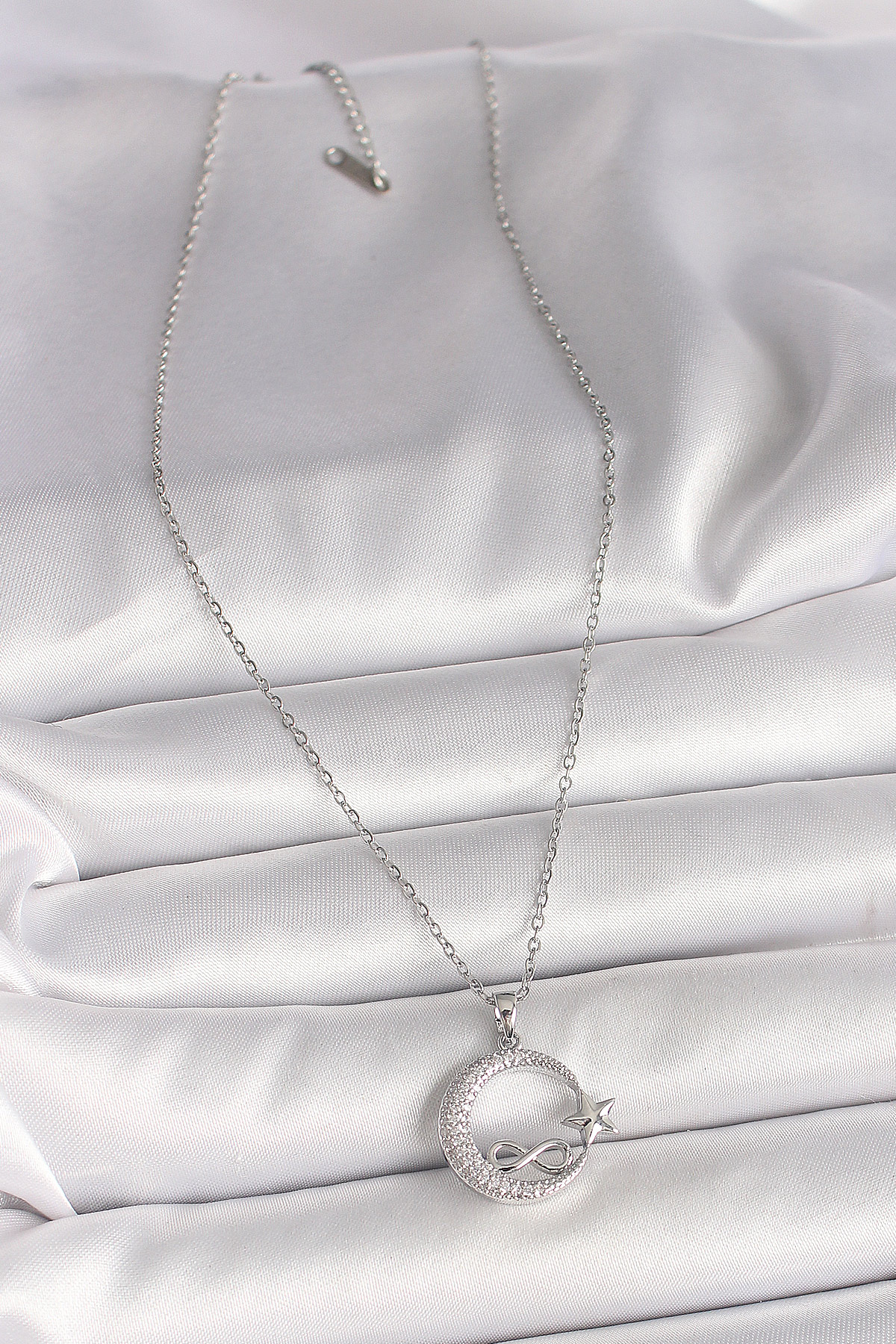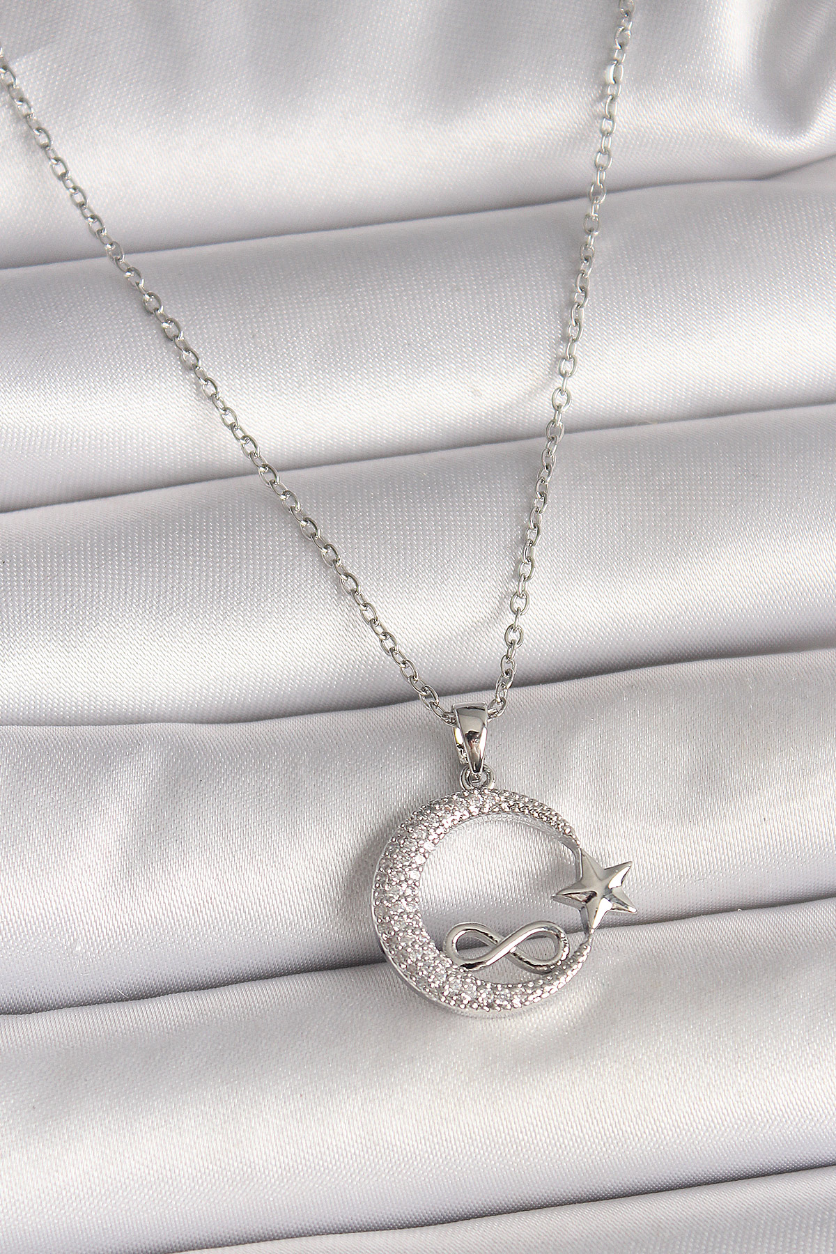 316L Çelik Gümüş Renk Zincir Zirkon Taşlı Ay Yıldız Model Sonsuzluk Detay Kadın Kolye - 261649