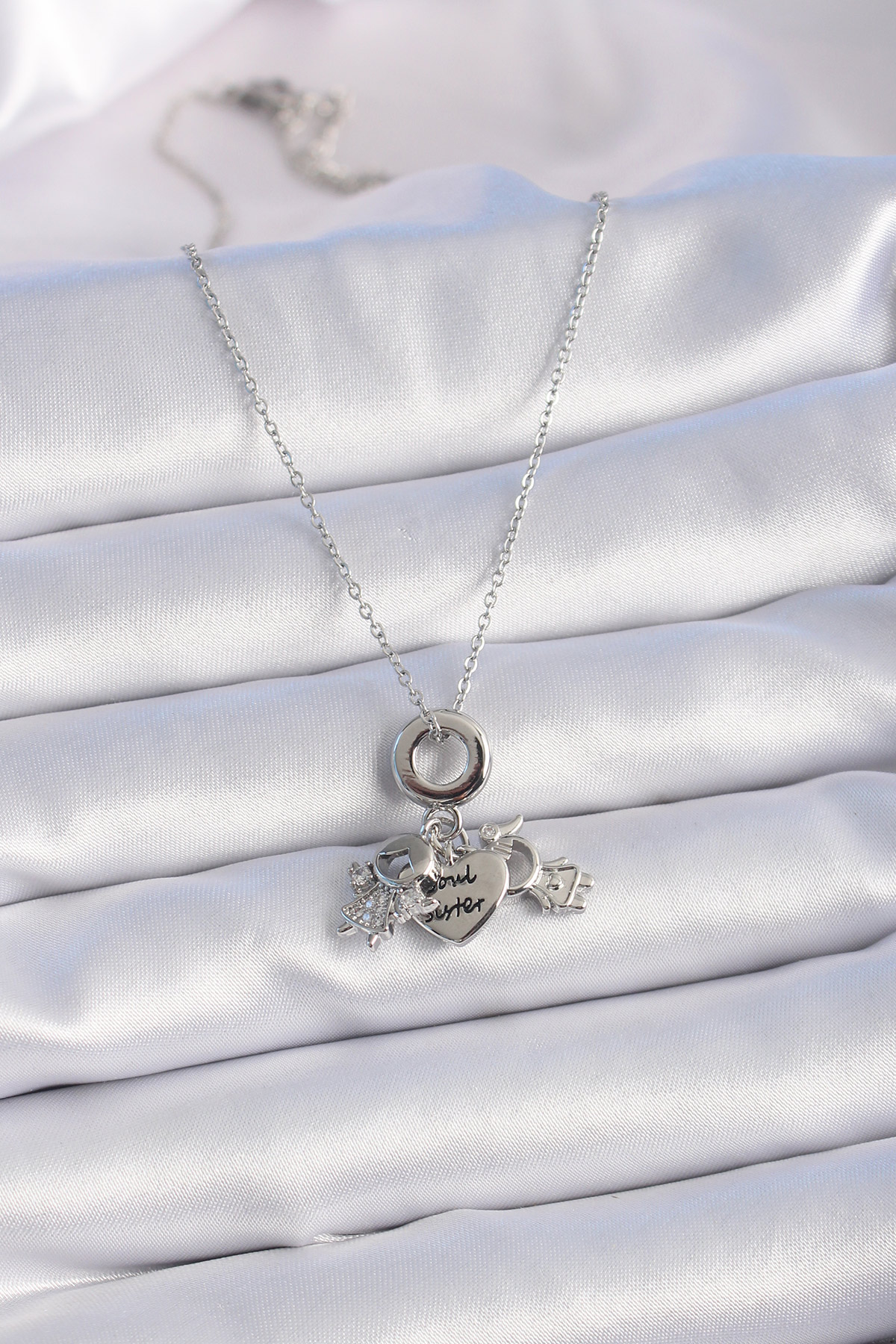 316L Çelik Gümüş Renk Zirkon Taş Detay Çocuk Figür Charm Model Kadın Kolye - 257736