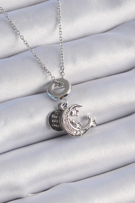 316L Çelik Gümüş Renk Zirkon Taşlı Ay Yıldız Figür Charm Model Kadın Kolye - 257724