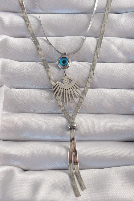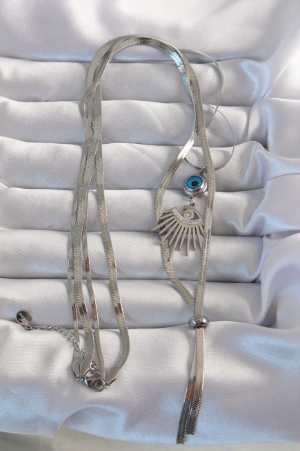316L Çelik Gümüş Renk Zirkon Taşlı Göz Detay Nazarlı Uzun Asansör Model Kolye - 256539