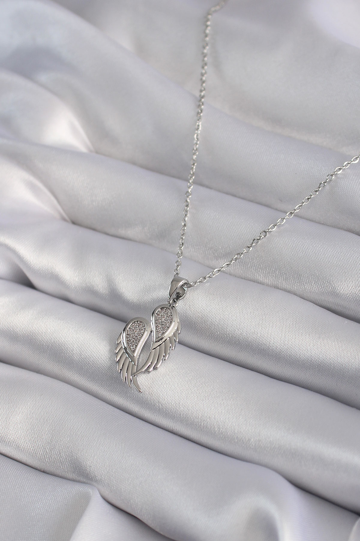 316L Çelik Gümüş Renk Zirkon Taşlı Kanat Model Kadın Kolye - 254165