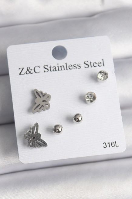 316L Çelik Gümüş Renk Zirkon Taşlı Kelebek Model Kadın Küpe Seti - 260069