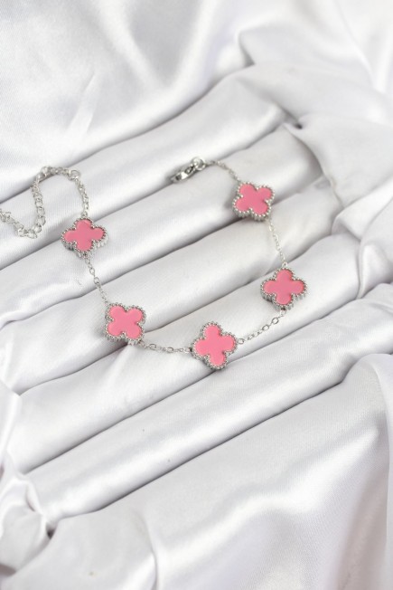 316L Çelik Gümüş Zincir Pembe Renk Yonca Bileklik - 265640