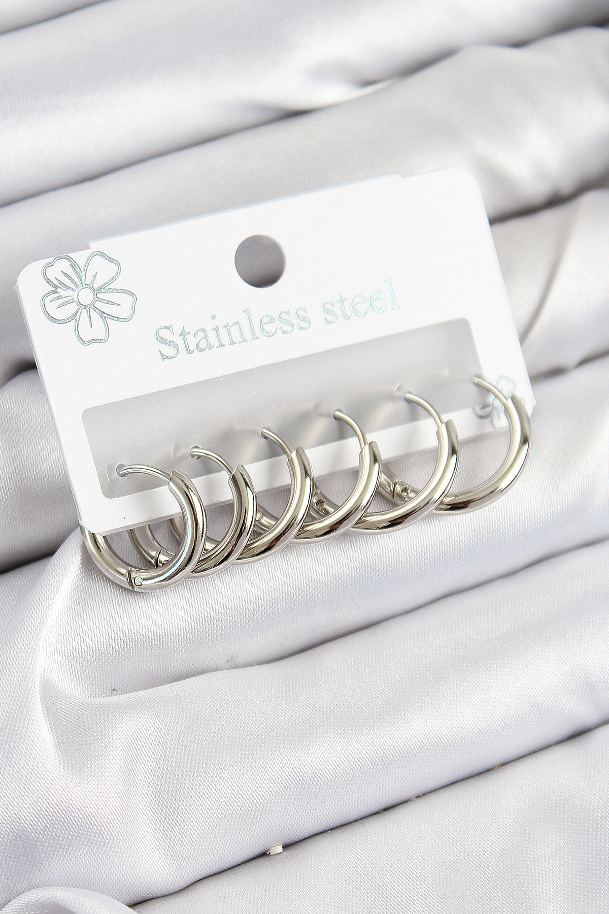 316L Çelik Halka Model Gümüş Renk 3'lü Set Kadın Küpe - 264459