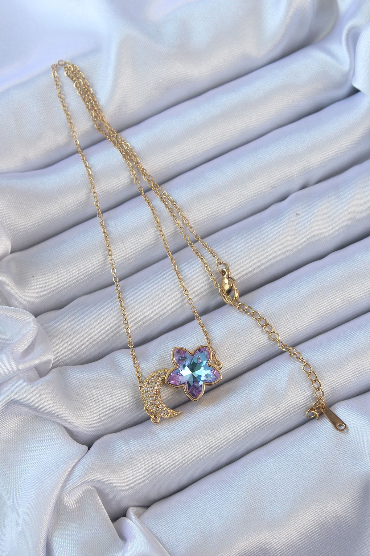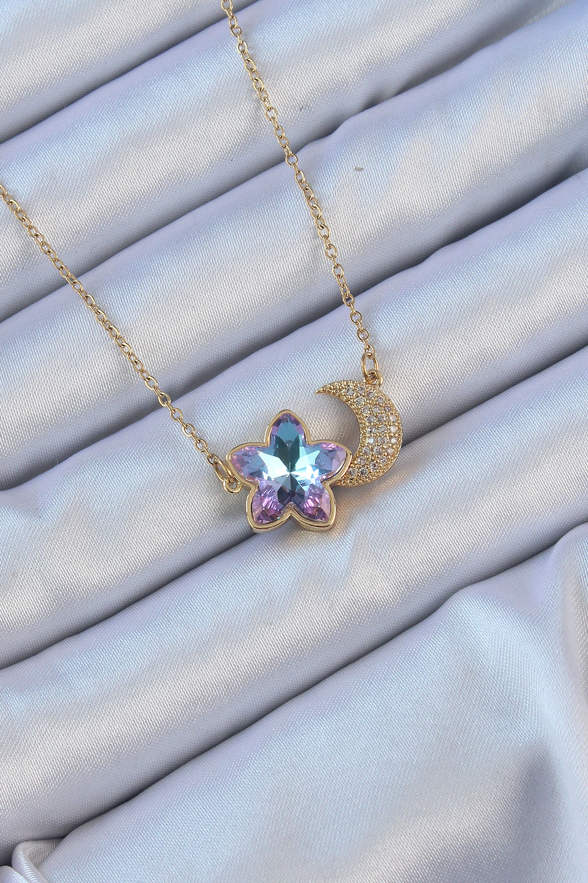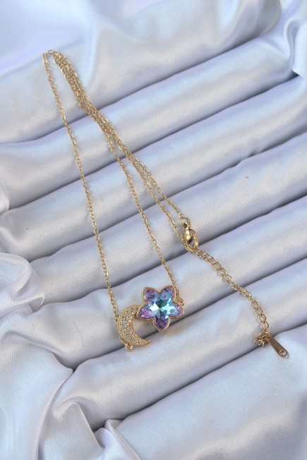 316L Çelik Zincir Altın Renk Ay Tasarımlı Renkli Zirkon Taşlı Çiçek Kolye - 256921