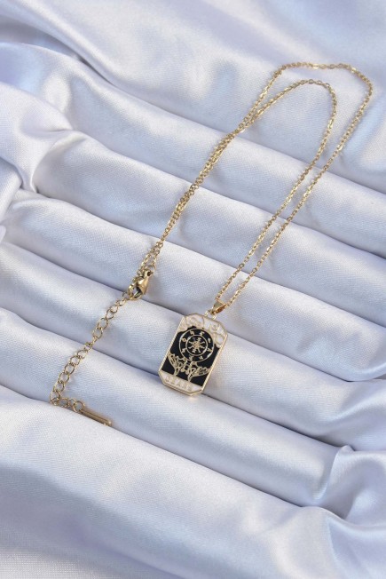 316L Çelik Zincir Altın Renk İşlemeli Siyah Mineli Tarot Kolye - 257418
