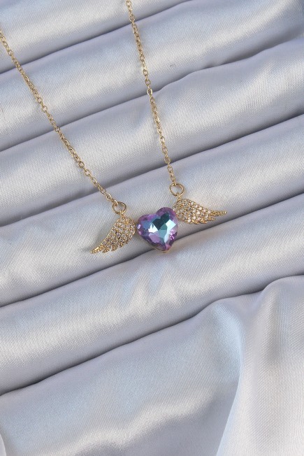 316L Çelik Zincir Altın Renk Mavi Mor Zirkon Taşlı Kanatlı Kalp Kolye - 256947