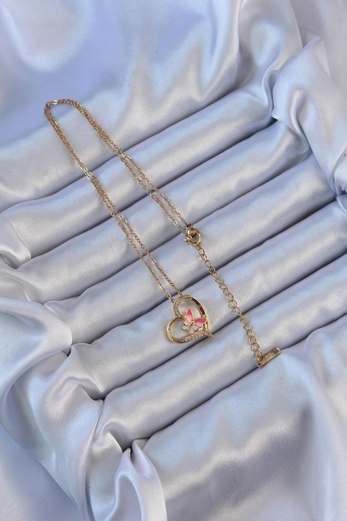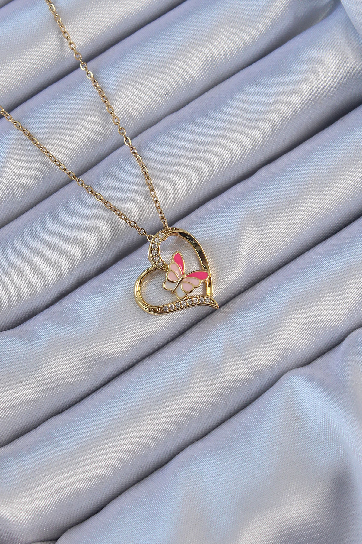 316L Çelik Zincir Altın Renk Mineli Kelebek Figür Zirkon Taşlı Kalp Kolye - 256893