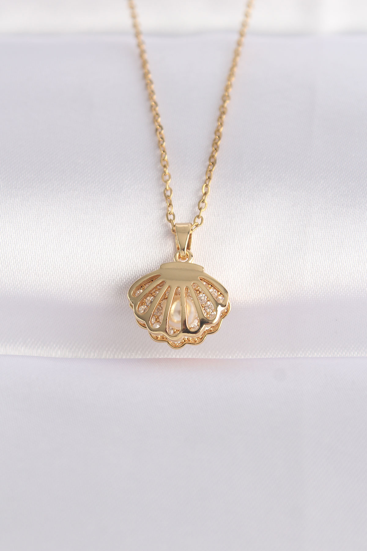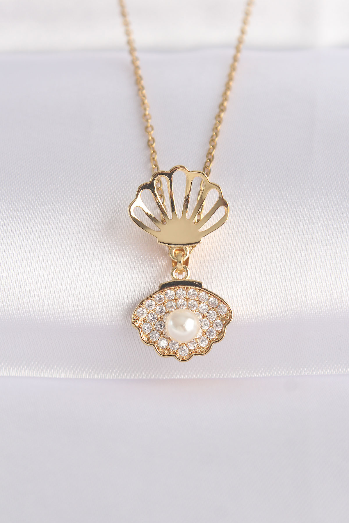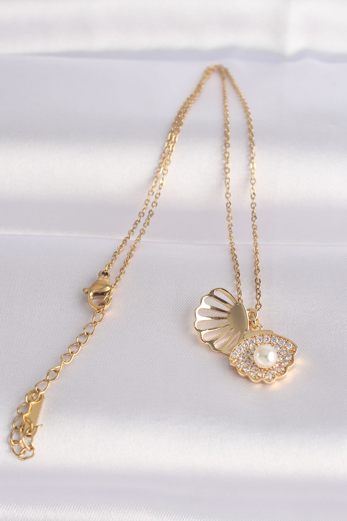316L Çelik Zincir Altın Renk Zirkon Taşlı İnci Detay İstiridye Kolye - 255196
