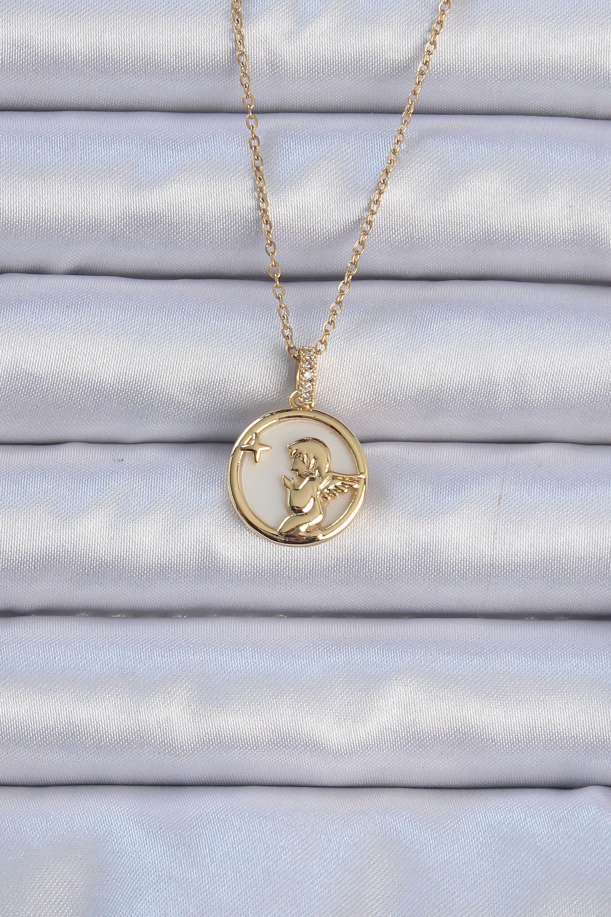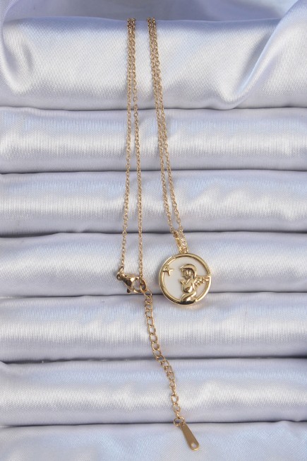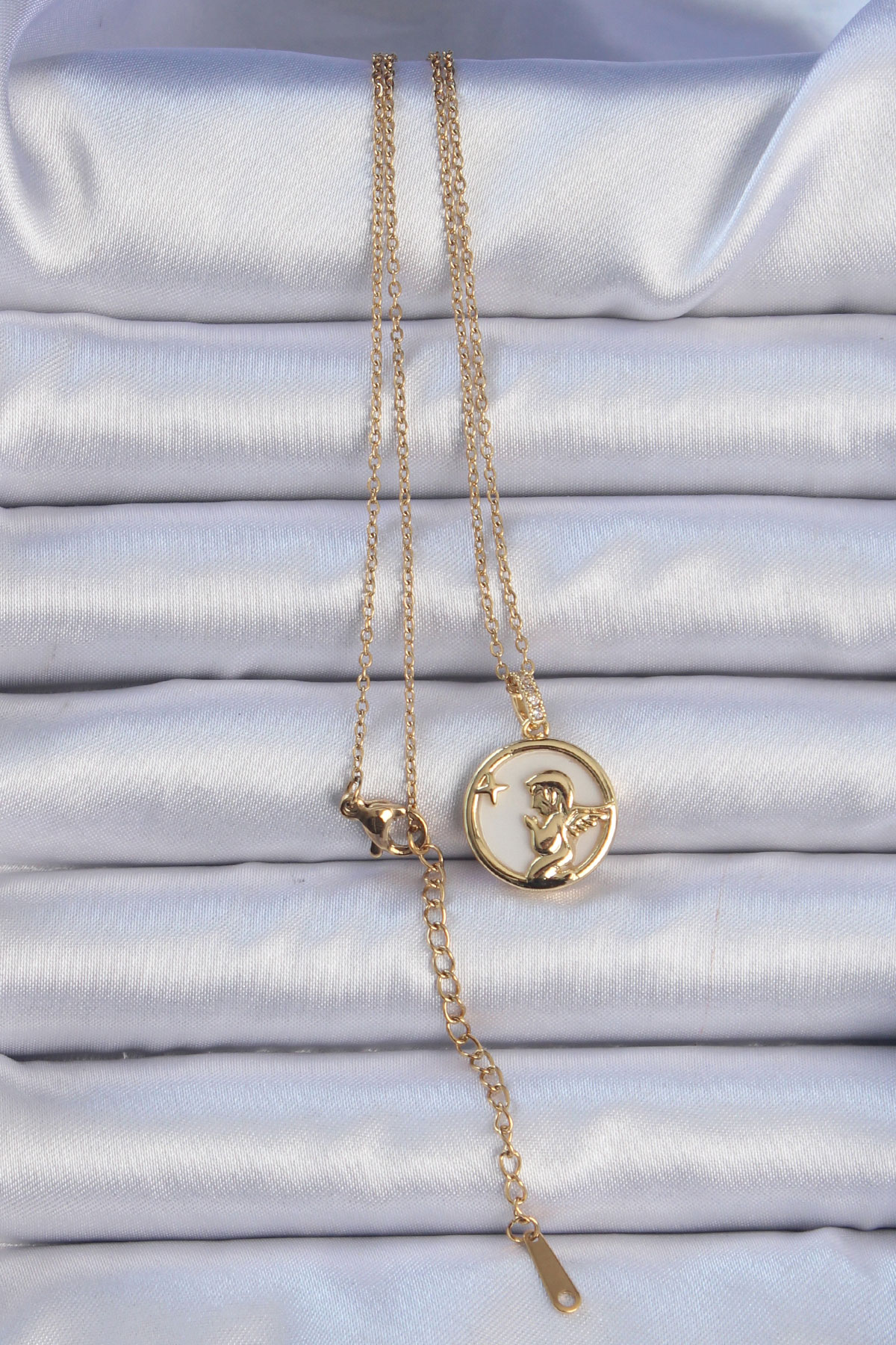 316L Çelik Zincir Altın Renk Zirkon Taşlı Mineli Melek Kolye - 256871
