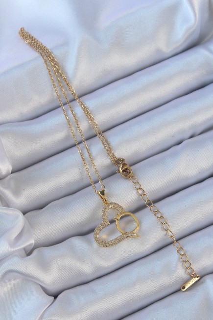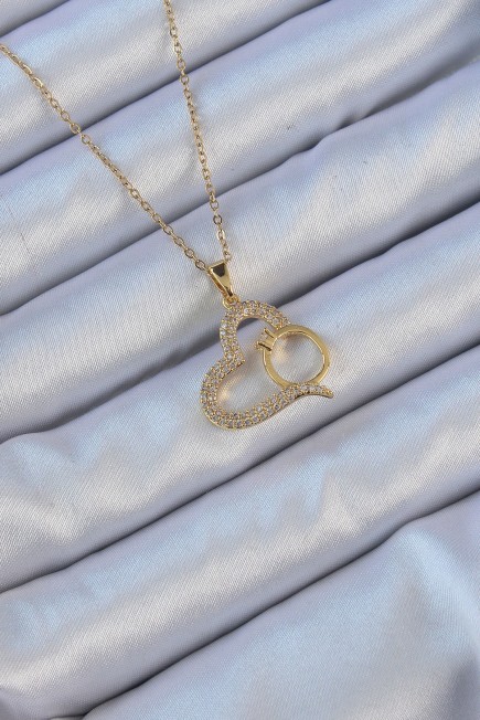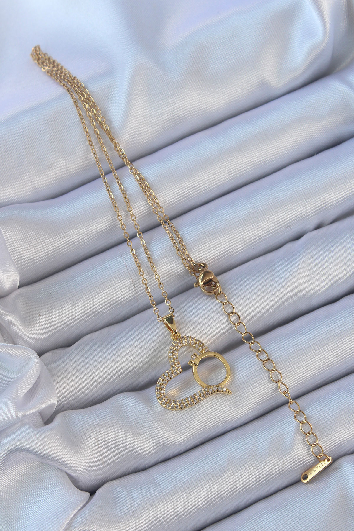 316L Çelik Zincir Altın Renk Zirkon Taşlı Yüzüklü Kalp Kolye - 256931