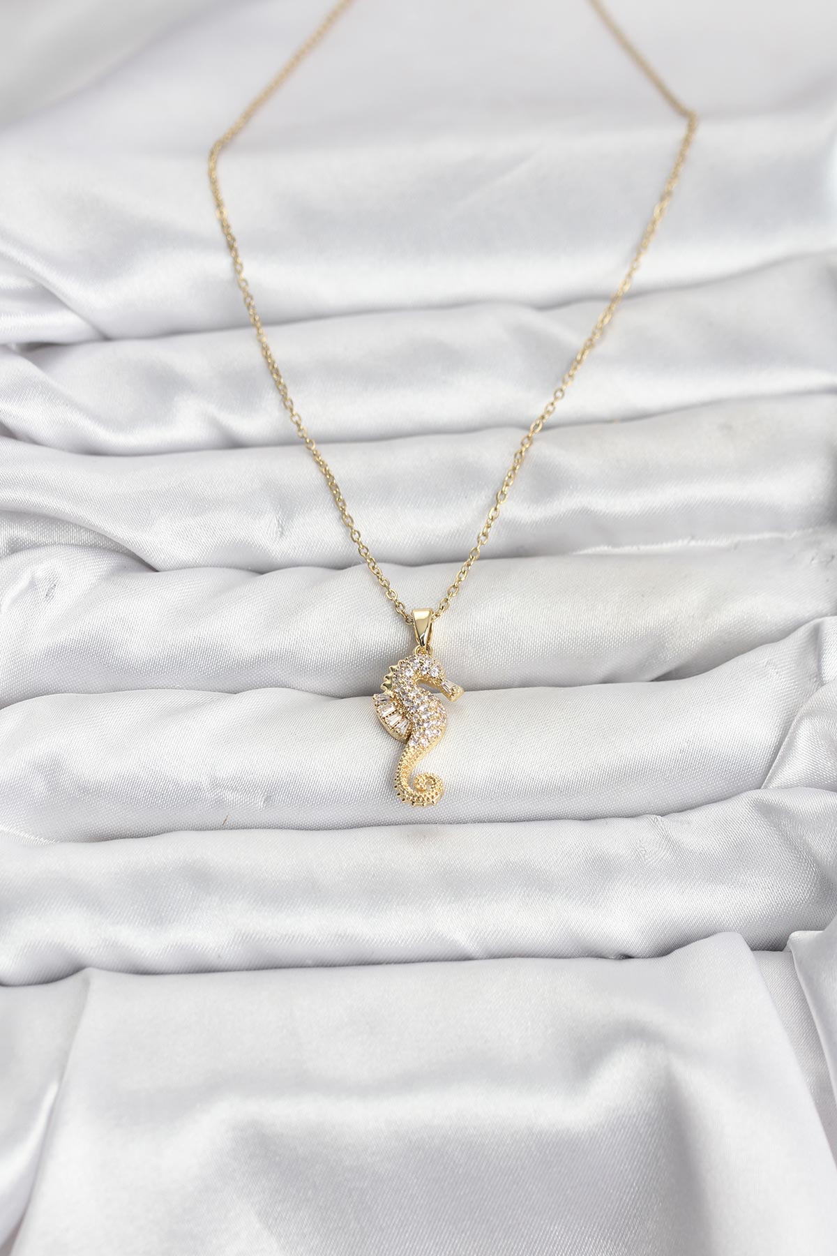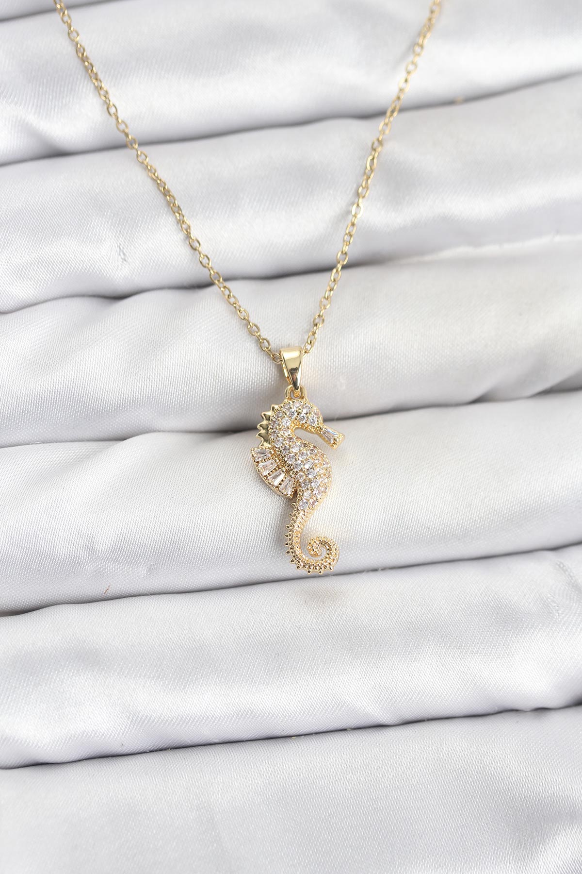 316L Çelik Zincir Gold Renk Deniz Atı Model Zirkon Taşlı Kadın Kolye - 267158