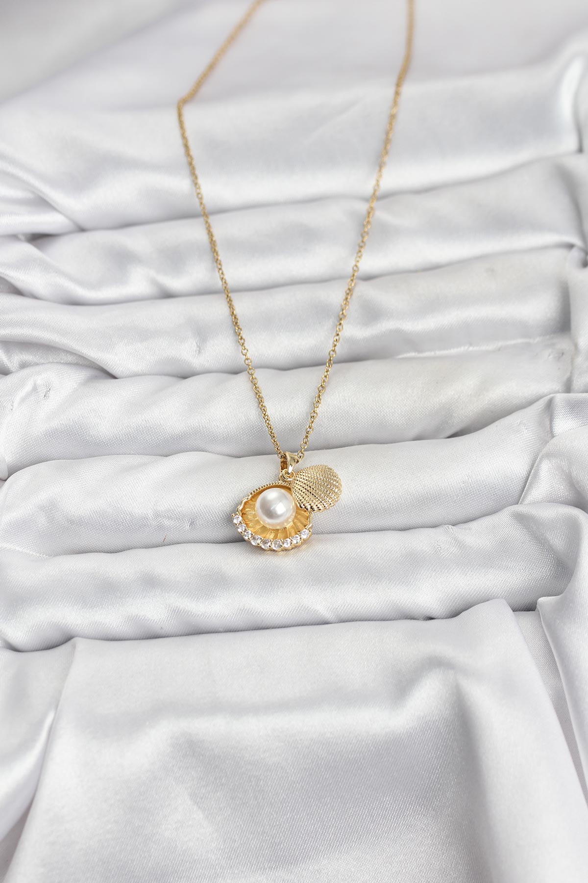 316L Çelik Zincir Gold Renk İncili Deniz Kabuğu Model Zirkon Taşlı Kadın Kolye - 267174
