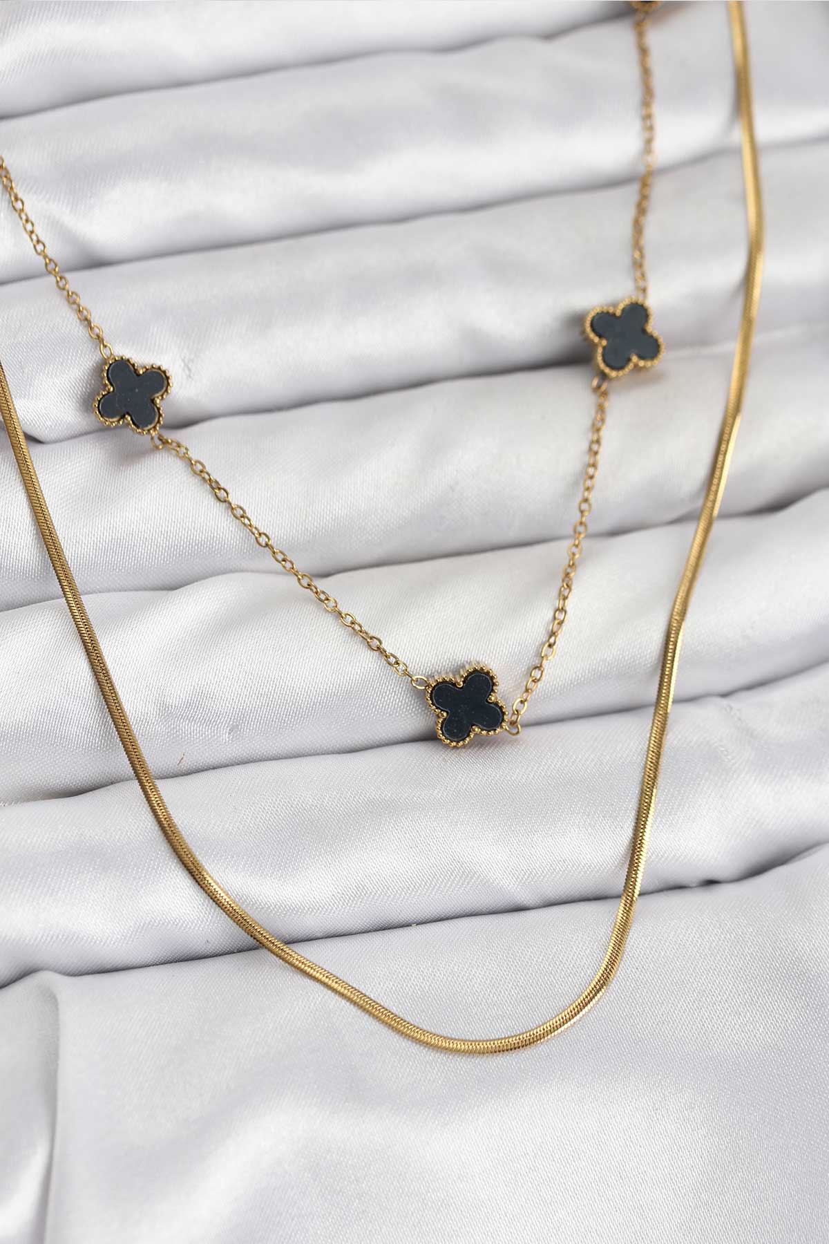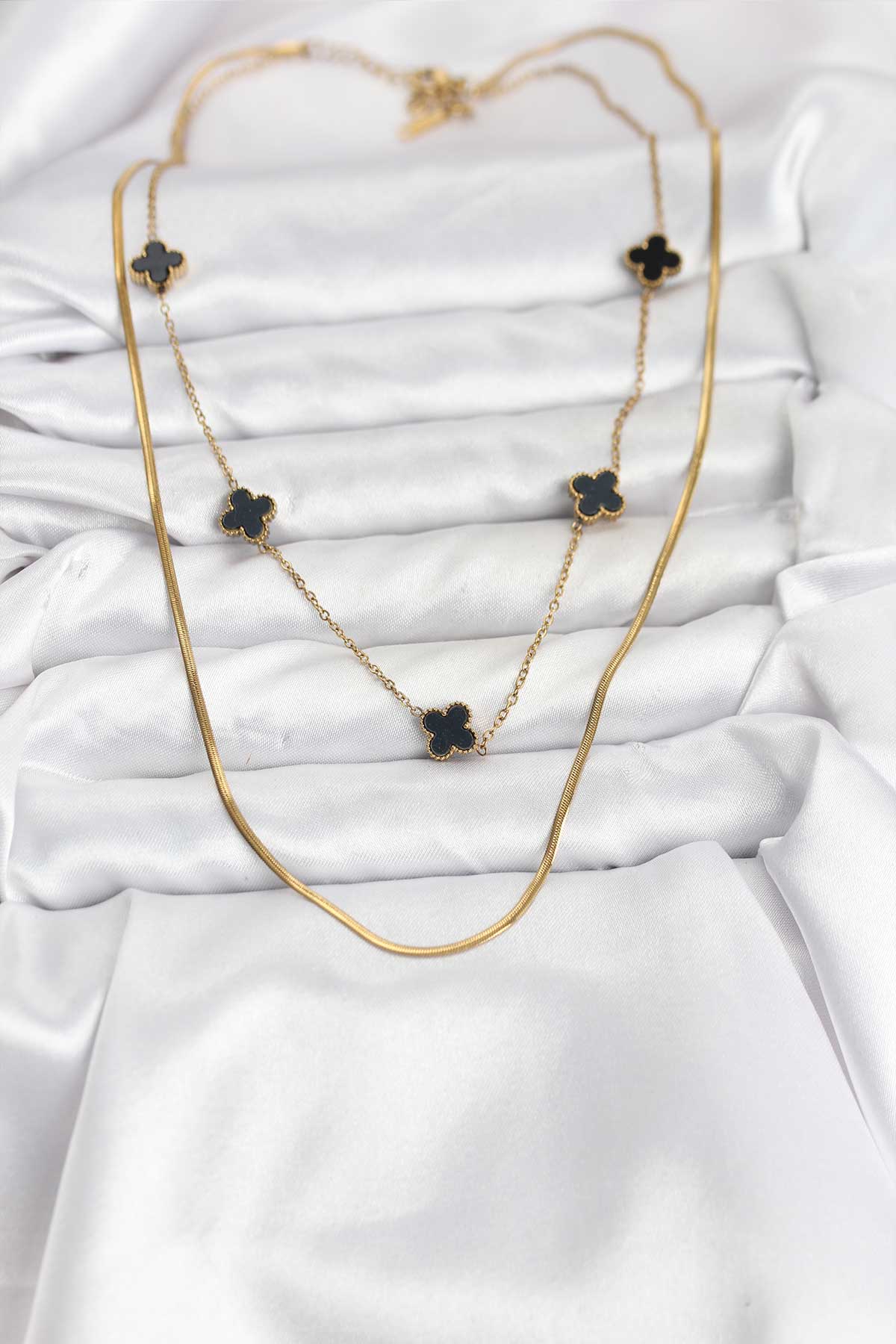 316L Çelik Zincir Gold Renk İtalyan Zincirli Siyah Yonca Model Kadın Kolye - 266676