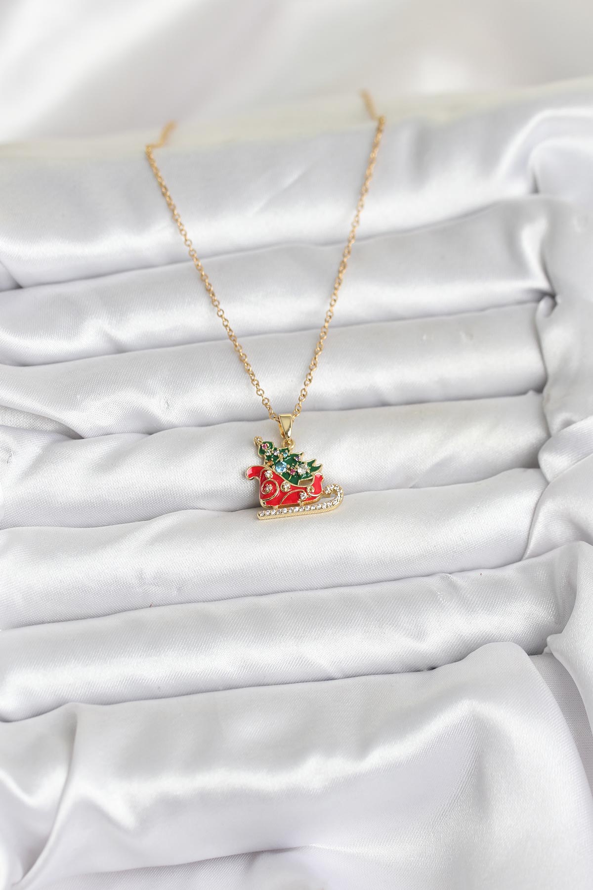 316L Çelik Zincir Gold Renk Kızak ve Çam Ağacı Figürlü Yılbaşı Temalı Kadın Kolye - 266362