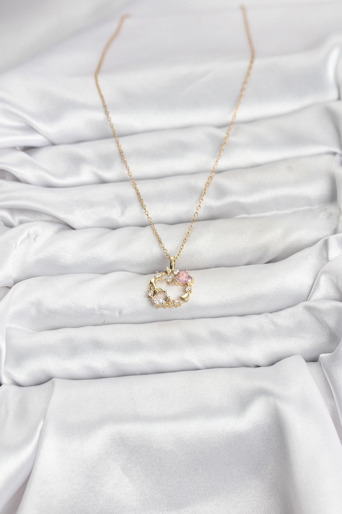 316L Çelik Zincir Gold Renk Pembe Taş Detaylı Çelenk Model Kadın Kolye - 267166