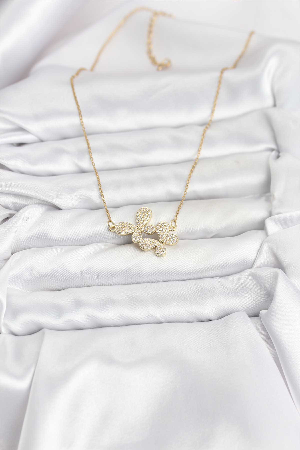 316L Çelik Zincir Gold Renk Zirkon Taşlı Kelebek Model Kadın Kolye - 266663