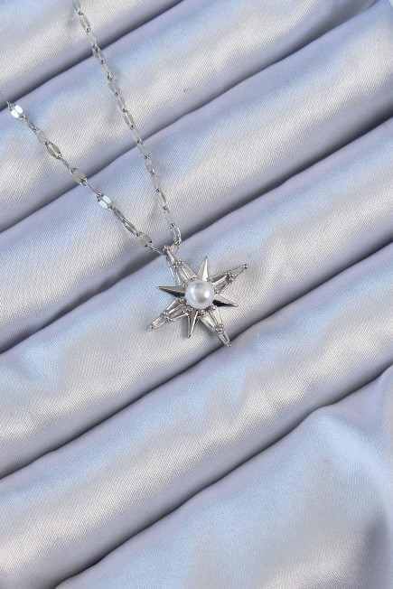 316L Çelik Zincir Gümüş Renk Baget Taşlı İnci Detay Kutup Yıldızı Kolye - 256906