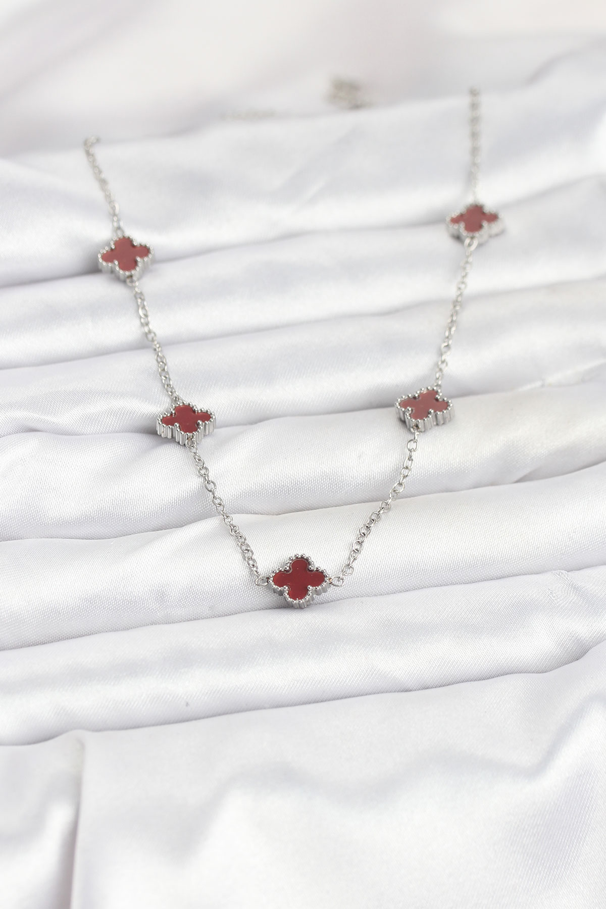316L Çelik Zincir Gümüş Renk Bordo Baby Boy Yonca Kadın Kolye - 265684