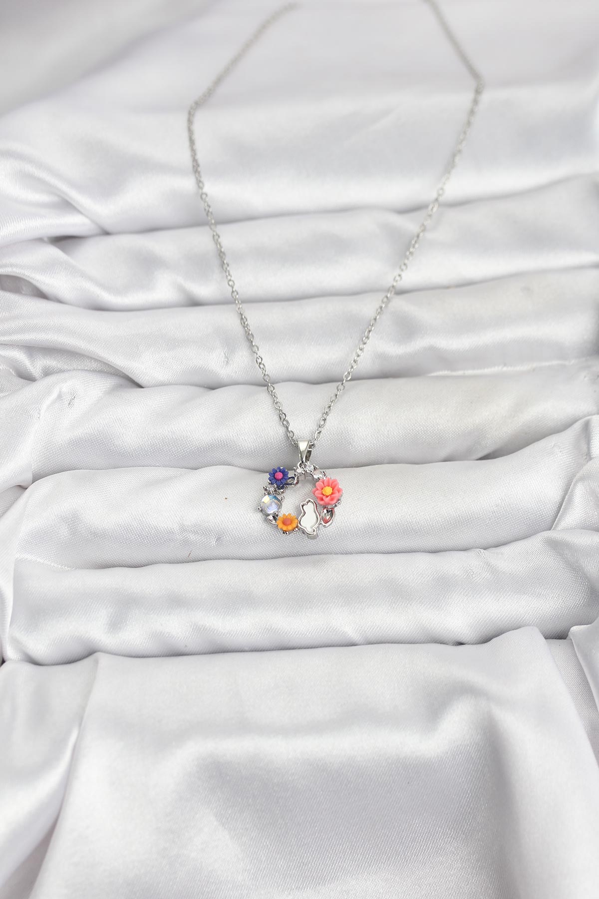 316L Çelik Zincir Gümüş Renk Çiçekli Kedili Model Kadın Kolye - 267133