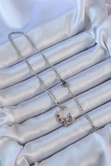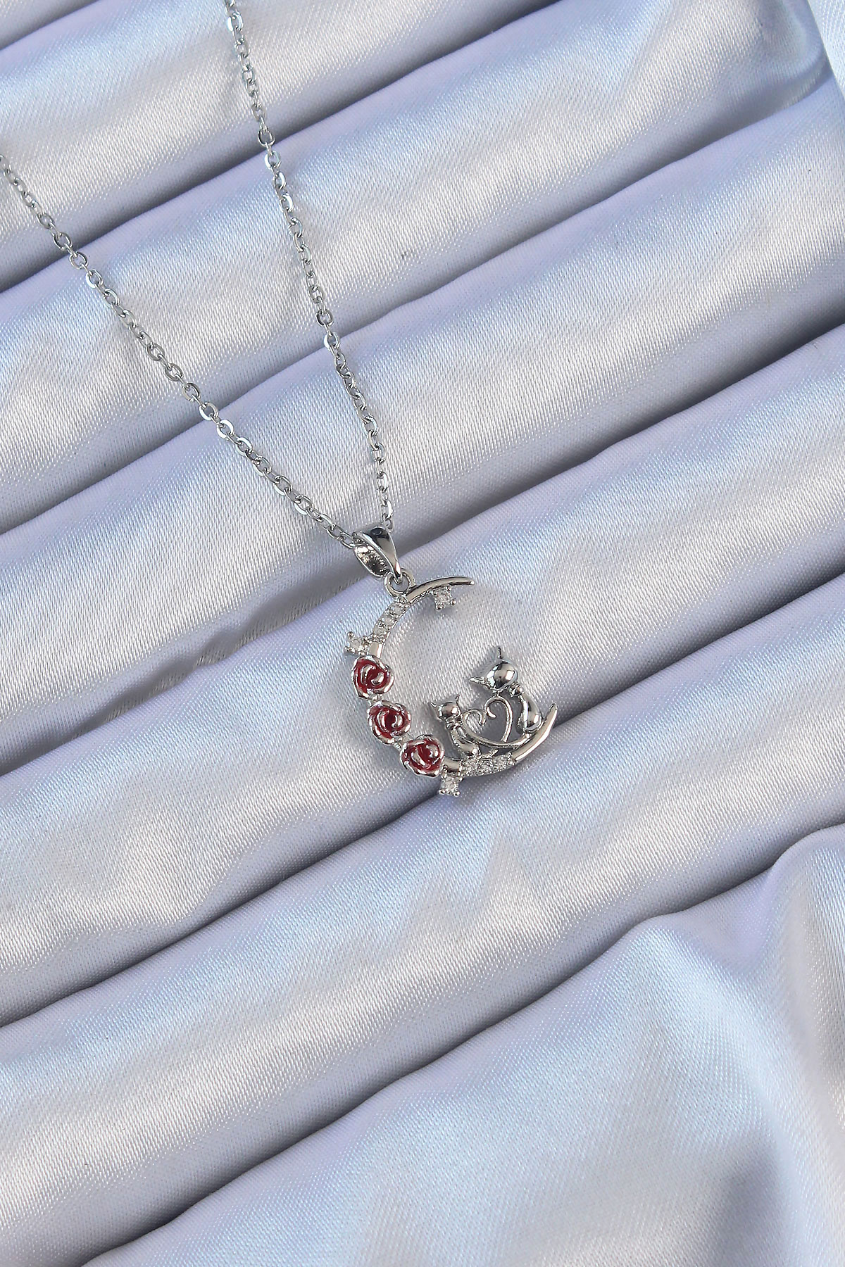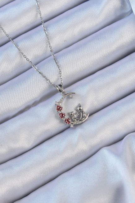 316L Çelik Zincir Gümüş Renk Kırmızı Gül Detay Kedi Figür Zirkon Taşlı Ay Kolye - 256916